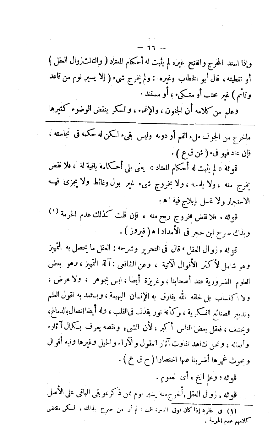 وإذا استد المخرج وانفتح غيره لم يثبت له أحكام المعتاد ( و ) الثالث ( زوال العقل ) أي تغطيته قال أبو الخطاب وغيره ولو تلجم ولم يخرج منه شيء إلحاقا بالغالب ( إلا يسير نوم من قاعد قائم ) غير محتب أو متكئ أو مستند وعلم من كلامه أن الجنون والاغماء والسكر ينقض كثيرها