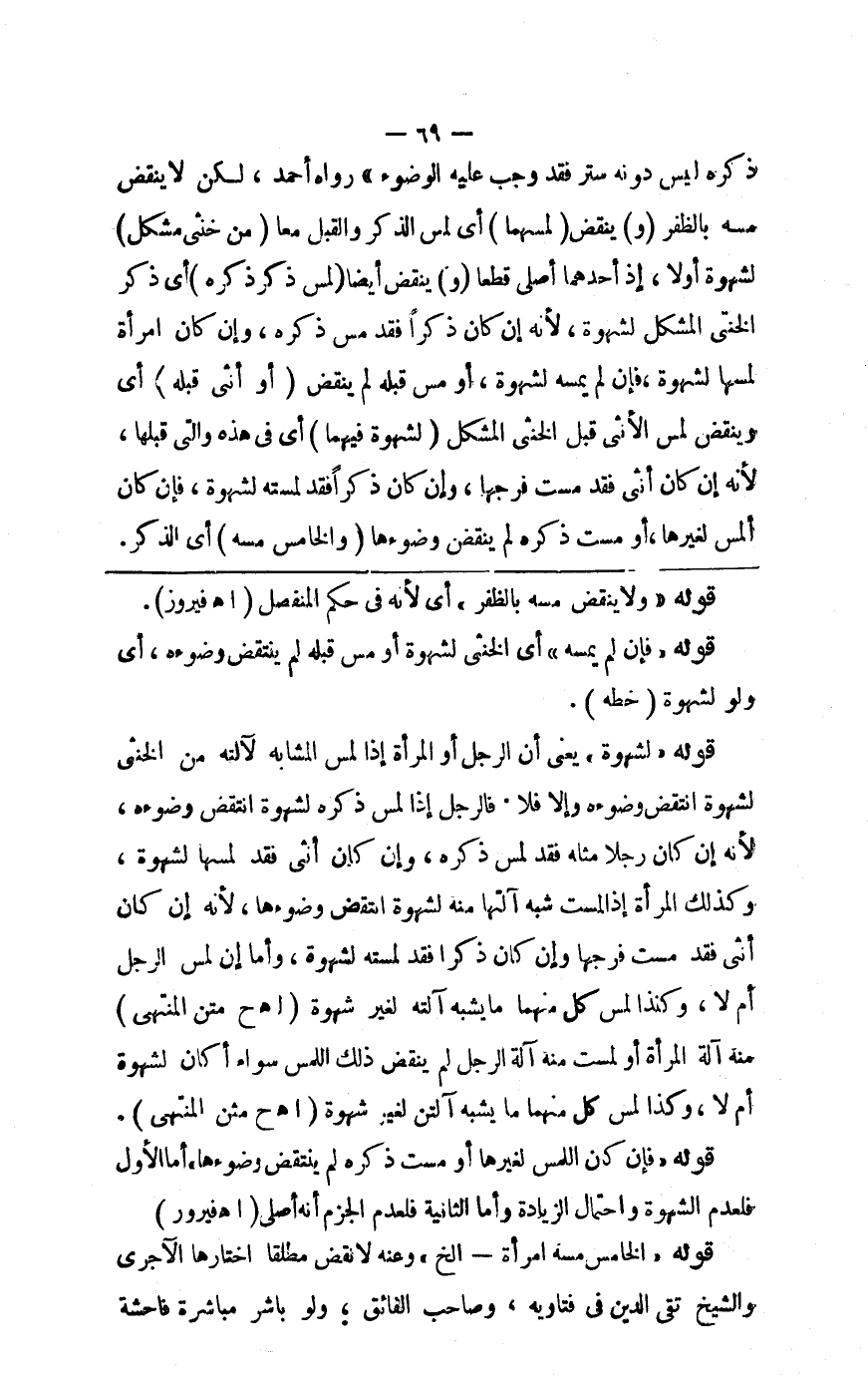 ذكره ليس دونه سترفقد وجب عليه الوضوء رواه أحمد لكن لا ينقض مسه بالظفر ( و ) ينقض ( لمسهما ) أي لمس الذكر والقبل معا ( من خنثى مشكل ) لشهوة أو لا إذ أحدهما أصلي قطعا ( و ) ينقض أيضا ( لمس ذكر ذكره ) أي ذكر الخنثى المشكل لشسهوة لأنه إن كان ذكرا فقد مس ذكره وإن كان امرأة فقد لمسها لشهوة فإن لم يمسه لشهوة أو مس قبله لم ينقض ( أو أنثى قبله ) أي وينقض لمس أنثى قبل الخنثى المشكل ( لشهوه فيهما ) أي في هذه والتي قبلها لأنه إذا كان أنثى فقد مست فرجها وإن كان ذكرا فقد لمسته لشهوة فإن كان اللمس لغيرها أو مست ذكره لم ينتقض وضوؤها ( و ) الخامس ( مس ) أي الذكر