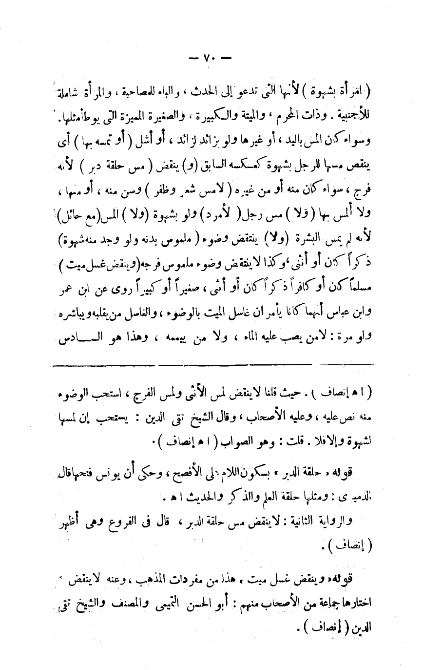 ( امرأة بشهوة ) لأنها التي تدعو إلى الحدث والباء للمصاحبة والمرأة شاملة للأجنبية وذات المحرم والميتة والكبيرة والصغيرة المميزة وسواء كان المس باليد أو غيرها ولو بزائد لزائد أو أشل ( و تمسه بها ) أي ينقض مسها للرجل بشهوة كعكسة السابق ( و ) ينقض ( مسح حلقه دبر ) لأنه فرج سواء كان منه أو من غيره ( لا مس شعر وظفر ) وسن منه أو منها ولا المس بها ( و ) لا مس رجل ( أمرد ) ولو بشهوة ( ولا ) المس ( مع حائل ) لأنه لم يمس البشرة ( ولا ) ينتقض وضوء ( ملموس بدنه ولو وجد منه شهوة ) ذكر كان أو أنثى وكذا لا ينتقض وضوء ملموس فرجه ( وينقض غسل ميت ) مسلما كان أو كافرا ذكرا كان أو أنثى صغيرا أو كبيرا روي عن ابن عمر وابن عباس أنهما كانا يأمران غاسل الميت بالوضوء والغاسل من يقلبه ويباشره ولو مرة لا من يصب عليه الماء ولا من ييممه وهذا هو السادس