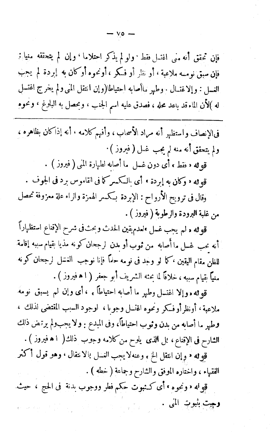 فإن تحقق أنه مني اغتسل فقط ولو لم يذكر احتلاما وإن لم يتحققه منيا فإن سبق نومه ملاعبة أو نظر أو فكر أو نحوه أو كان به أبردة لم يجب الغسل وإلا اغتسل وطهر ما أصابه احتياطا ( وإن انتقل ) المني ( ولم يخرج اغتسل له ) لأن الماء قد باعد محله فصدقه عليه اسم الجنب ويحصل به البلوغ ونحوه