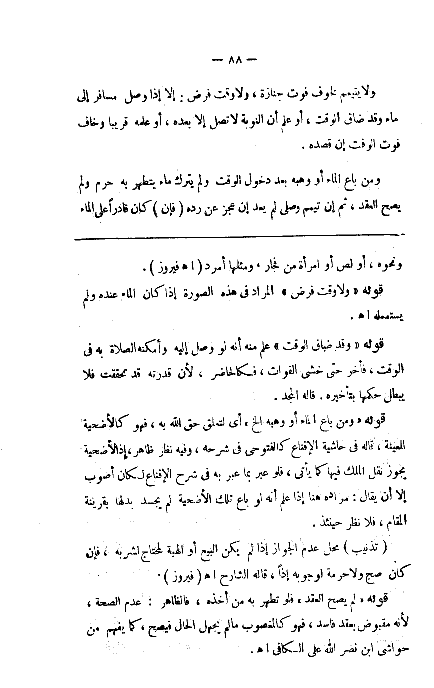 ولا يتيمم لخوف فوت جنازة ولا وقت فرض إلا إذا وصل مسافر إلى الماء وقد ضاق الوقت أو علم أن النوبة لاتصل إليه إلا بعده أو علمه قريبا وخاف فوت الوقت إن قصده ومن باع الماء أو وهبه بعد دخول الوقت ولم يترك ماء يتطهر به حرم ولم يصح العقد ثم إن تيمم وصلى لم يعد إن عجز عن رده ( فإن ) كان قادرا على الماء
