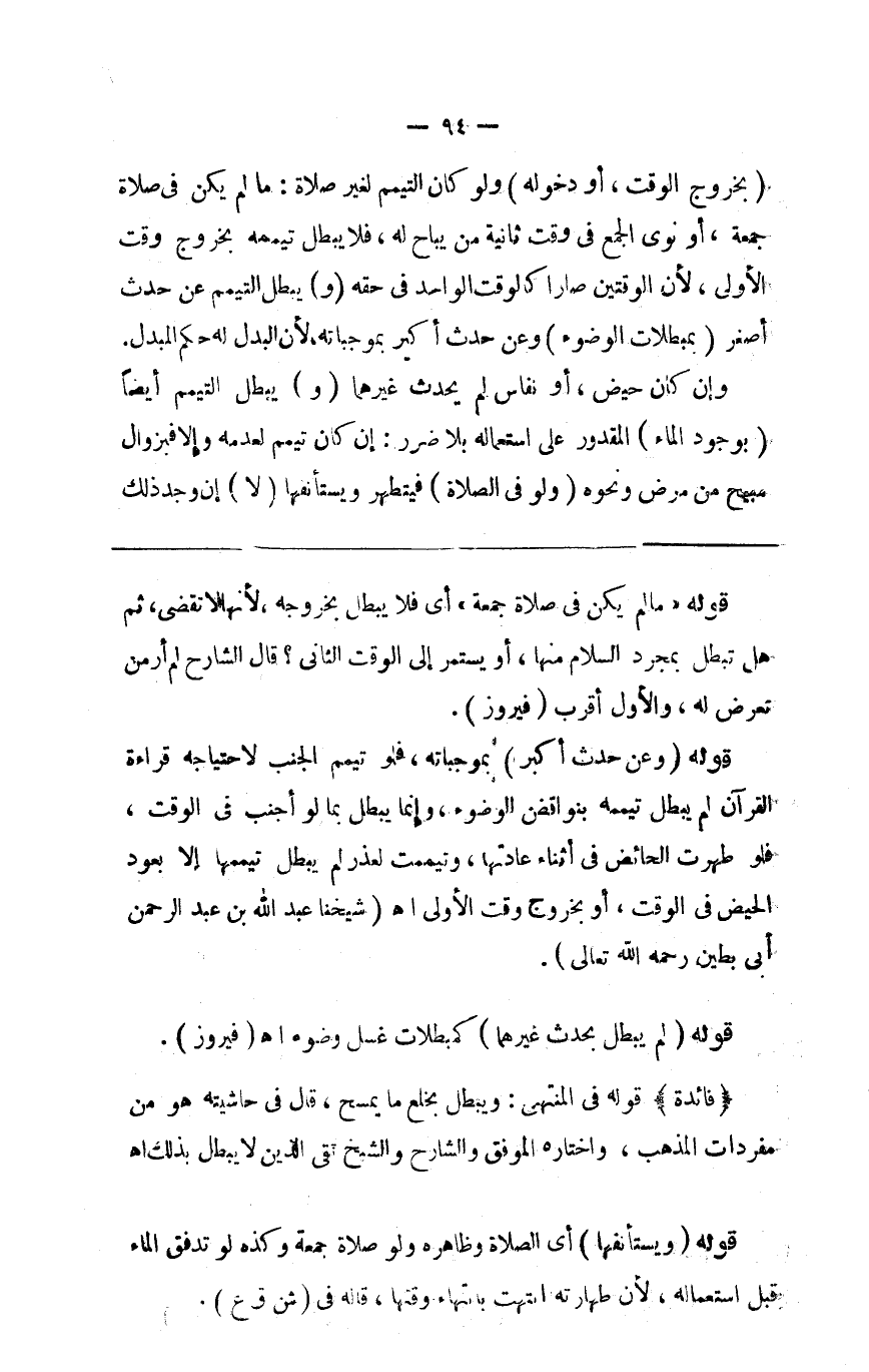 ( بخروج الوقت ) أو دخوله ولو كان التيمم لغير صلاة ما لم يكن في صلاة الجمعة أو نوى الجمع في وقت ثانية من يباح له فلا يبطل تيممه بخروج وقت الأولى لأن الوقتين صارا كالوقت الواحد في حقه ( و ) يبطل التيمم عن حدث أصغر ( بمبطلات الوضوء ) وعن حدث أكبر بموجباته لأن البدل له حكم المبدل وإن كان لحيض أو نفاس لم يبطل بحدث غيرهما ( و ) يبطل التيمم أيضا ( بوجود الماء ) المقدور على استعماله بلا ضرر إن كان تيمم لعدمه وإلا فبزوال مبيح من مرض ونحوه ( ولو في الصلاة ) فيتطهر ويستأنفها ( لا ) إن وجد ذلك