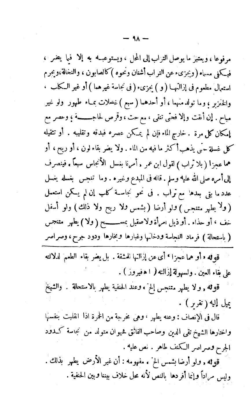 مرفوعا 0 ويعتبر ما يوصل التراب إلى المحل ويستوعبه به إلا فيما يضر فيكفي مسماه ويجزئ عن التراب أشنان ونحوه كالصابون والنخالة ويحرم استعمال مطعموم في إزالتها ( و ) يجزئ ( في نجاسة غيرهما ) أي غير الكلب والخنزير أو ما تولد منهما أو من أحدهما ( سبع ) غسلات بماء طهور ولو غير مباح إن أنقت وإلا فحتى تنقي مع حت وقرص لحاجة وعصر مع إمكان كل مرة خارج الماء فإن لم يمكن عصره فبدقه وتقليبه أو تثقيله كل غسلة حتى يذهب أكثر ما فيه من الماء ولا يضر بقاء لون أو ريح عجزا ( بلا تراب ) لقول ابن عمر أمرنا بغسل الأنجاس سبعا فينصرف إلى أمره صلى الله عليه وسلم قاله في المبدع وغيره وما تنجس بغسله يغسل عدد ما بقي بعدها مع تراب في نحو نجاسة كلب إن لم يكن استعمل ( ولا يطهر متنجس ) ولو أرضا ( بشمس ولا ريح ولا دلك ) ولو أسفل خف أو حذاء أو ذيل امرأة ولا صقيل بمسح ( و ) يطهر متنجس ب ( استحالة ) فرماد النجاسة ودخانها وغبارها وبخارها ودود جرح وصراصر