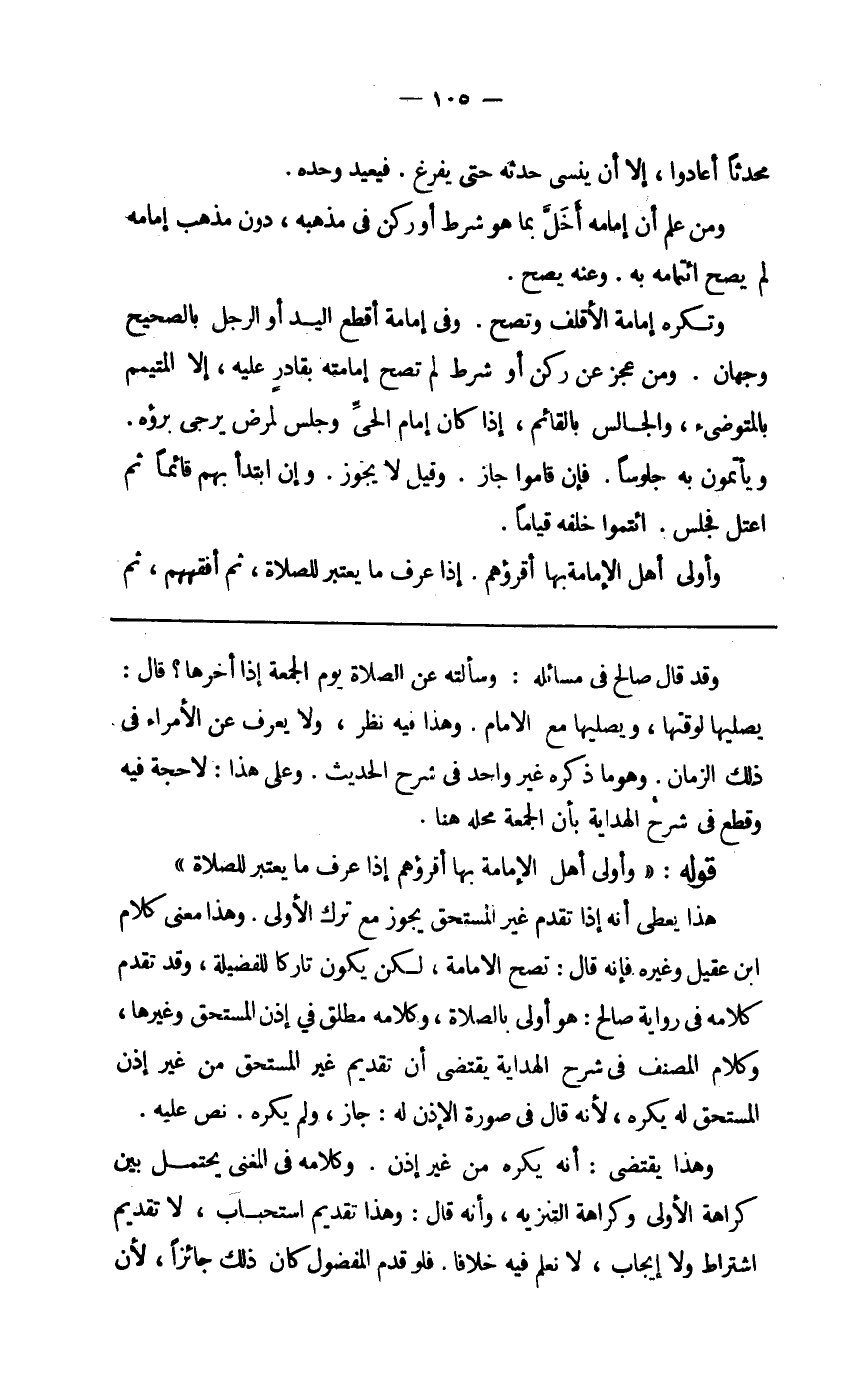 وَقد قَالَ صَالح فِي مسَائِله وَسَأَلته عَن الصَّلَاة يَوْم الْجُمُعَة إِذا أَخّرهَا يُصليهَا لوَقْتهَا ويصليها مَعَ الإِمَام وَهَذَا فِيهِ نظر وَلَا يعرف عَن الْأُمَرَاء فِي ذَلِك الزَّمَان وَهُوَ مَا ذكره غير وَاحِد فِي شرح الحَدِيث وعَلى هَذَا لَا حجَّة فِيهِ وَقطع فِي شرح الْهِدَايَة بِأَن الْجُمُعَة مَحَله هُنَا