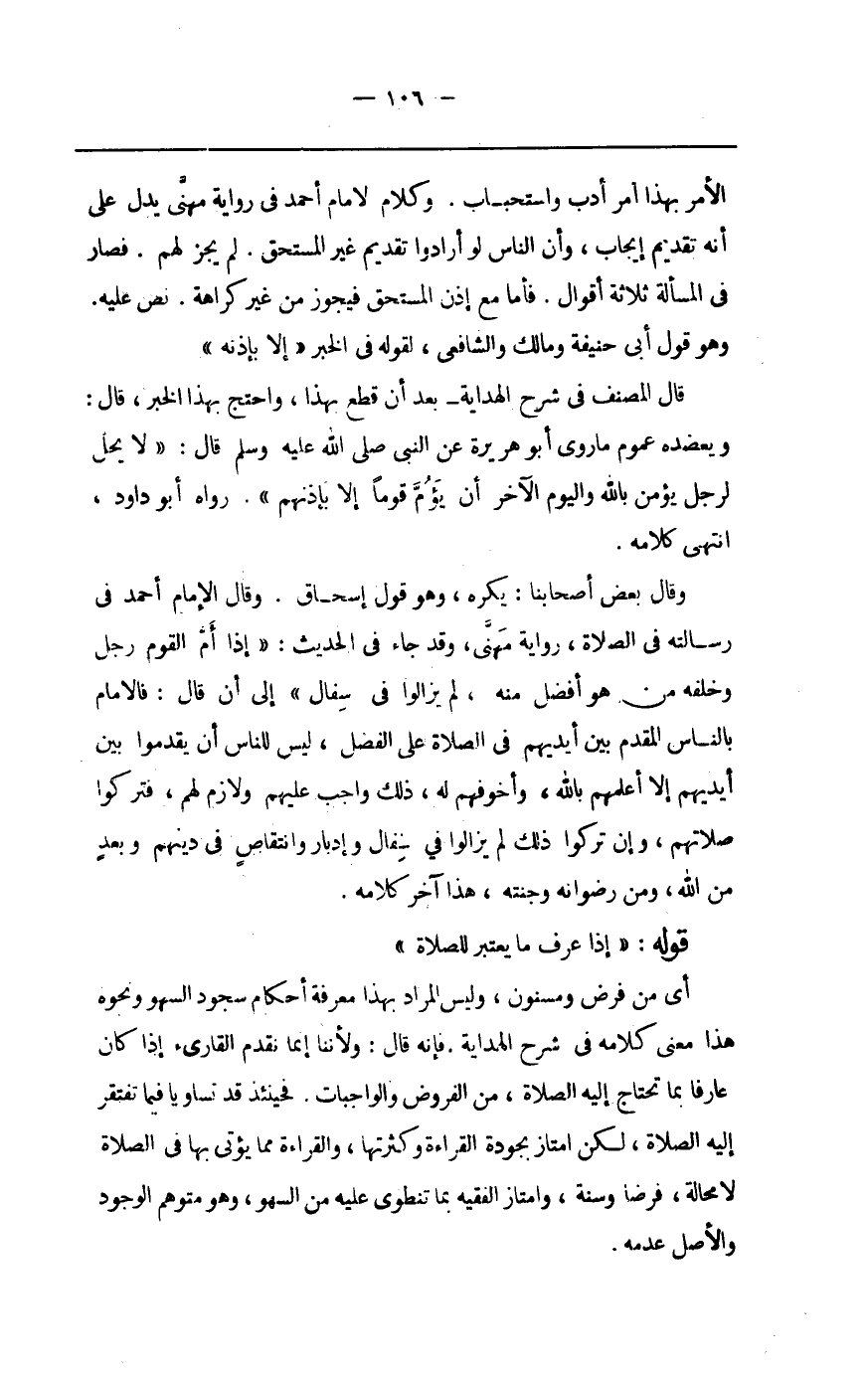 الْأَمر بِهَذَا أَمر أدب واستحباب وَكَلَام الإِمَام أَحْمد فِي رِوَايَة مهنى يدل على أَنه تَقْدِيم إِيجَاب وَأَن النَّاس لَو أَرَادوا تَقْدِيم غير الْمُسْتَحق لم يجز لَهُم فَصَارَ فِي الْمَسْأَلَة ثَلَاثَة أَقْوَال فَأَما مَعَ إِذن الْمُسْتَحق فَيجوز من غير كَرَاهَة نَص عَلَيْهِ وَهُوَ قَول أبي حنيفَة وَمَالك وَالشَّافِعِيّ لقَوْله فِي الْخَبَر إِلَّا بِإِذْنِهِ