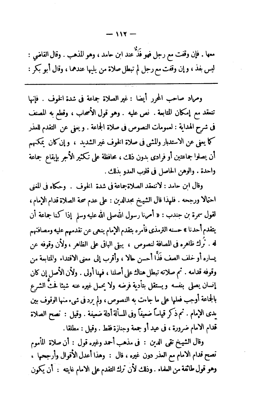 وَقَالَ ابْن حَامِد لَا تَنْعَقِد الصَّلَاة جمَاعَة فِي شدَّة الْخَوْف وَحَكَاهُ فِي الْمُغنِي احْتِمَالا وَرجحه فَلهَذَا قَالَ الشَّيْخ مجد الدّين على عدم صِحَة الصَّلَاة قُدَّام الإِمَام لقَوْل سَمُرَة بن جُنْدُب أمرنَا رَسُول الله صلى الله عَلَيْهِ وَسلم إِذا كُنَّا جمَاعَة أَن يتَقَدَّم أَحَدنَا حسنه التِّرْمِذِيّ فَأمره بتقدم الإِمَام ينْهَى عَن تقدمهم عَلَيْهِ ومصافتهم لَهُ ترك ظَاهره فِي المصافة لنصوص يبْقى الْبَاقِي على الظَّاهِر وَلِأَن وُقُوفه عَن يسَاره أَو خلف الصَّفّ فَذا أحسن حَالا وَأقرب إِلَى معنى الِاقْتِدَاء والمتابعة من وُقُوفه قدامه ثمَّ صلَاته تبطل هُنَاكَ على أصلنَا فَهُنَا أولى وَلِأَن الأَصْل إِن كَانَ إِنْسَان يُصَلِّي بِنَفسِهِ ويستقل بتأدية فَرْضه وَلَا يحمل غَيره عَنهُ شَيْئا فَحَث الشَّرْع بِالْجَمَاعَة أوجب فعلهَا على مَا جَاءَت بِهِ النُّصُوص وَلم يرد فِي شَيْء مِنْهَا الْوُقُوف بَين يَدي الإِمَام ثمَّ ذكر قِيَاسا ضَعِيفا وَفِي الْمَسْأَلَة أَدِلَّة ضَعِيفَة وَقيل تصح الصَّلَاة قُدَّام الإِمَام ضَرُورَة فِي عيد أَو جُمُعَة وجنازة فَقَط وَقيل مُطلقًا