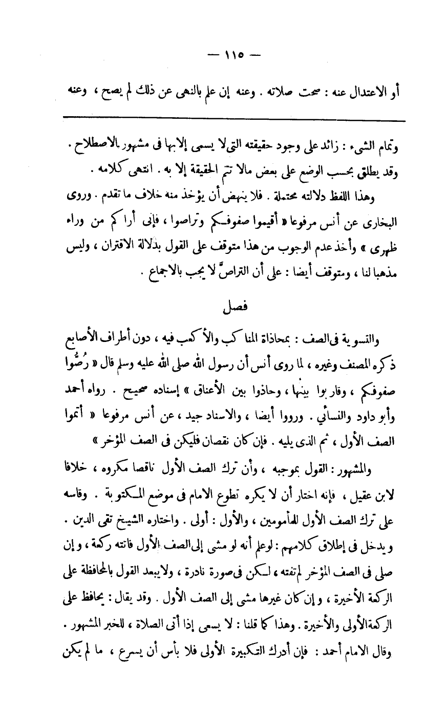 والتسوية فِي الصَّفّ بمحاذاة المناكب والأكعب فِيهِ دون أَطْرَاف الْأَصَابِع ذكره المُصَنّف وَغَيره لما روى أنس أَن رَسُول الله صلى الله عَلَيْهِ وَسلم قَالَ رصوا صفوفكم وقاربوا بَينهَا وحاذوا بَين الْأَعْنَاق إِسْنَاده صَحِيح رَوَاهُ أَحْمد وَأَبُو دَاوُد وَالنَّسَائِيّ وَرووا أَيْضا والاسناد جيد عَن أنس مَرْفُوعا أَتموا الصَّفّ الأول ثمَّ الَّذِي يَلِيهِ فَإِن كَانَ نُقْصَان فَلْيَكُن فِي الصَّفّ الْمُؤخر