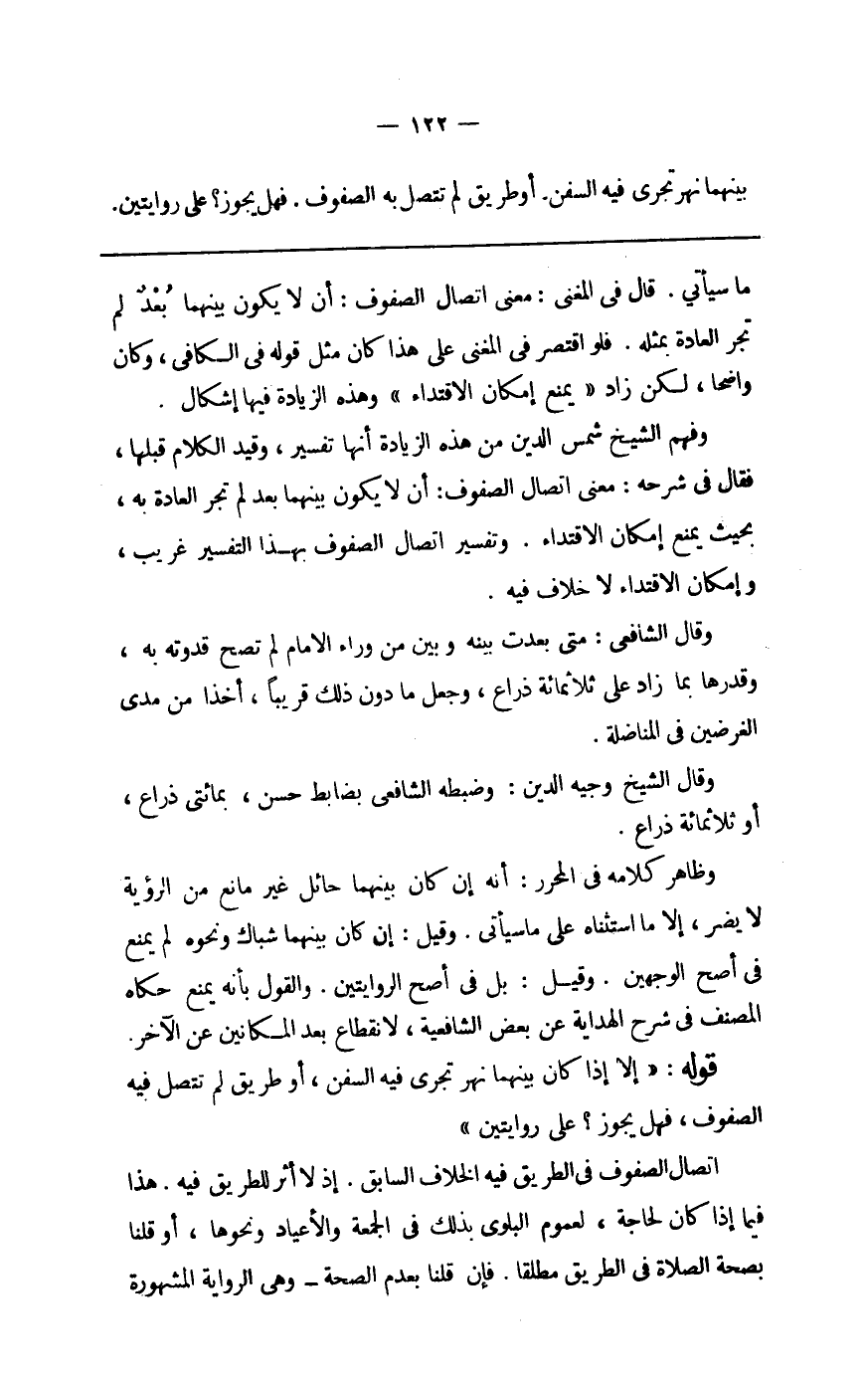 قَوْله إِلَّا إِذا كَانَ بَينهمَا نهر تجْرِي فِيهِ السفن أَو طَرِيق لم تتصل فِيهِ الصُّفُوف فَهَل يجوز على رِوَايَتَيْنِ