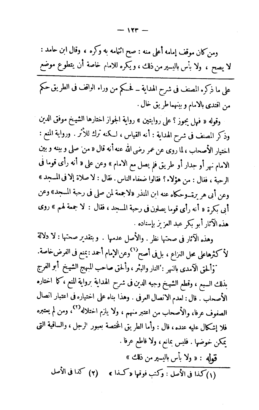 وَقَوله فَهَل يجوز على رِوَايَتَيْنِ رِوَايَة الْجَوَاز اخْتَارَهَا الشَّيْخ موفق الدّين وَذكر المُصَنّف فِي شرح الْهِدَايَة أَنه الْقيَاس لكنه ترك للأثر وَرِوَايَة الْمَنْع اخْتِيَار الْأَصْحَاب لما رُوِيَ عَن عمر رَضِي الله عَنهُ أَنه قَالَ من صلى وَبَينه وَبَين الامام نهر أَو جِدَار أَو طَرِيق فَلم يصل مَعَ الامام وَعَن عَليّ أَنه رأى قوما فِي الرحبة فَقَالَ من هَؤُلَاءِ فَقَالُوا ضعفاء النَّاس فَقَالَ لَا صَلَاة إِلَّا فِي الْمَسْجِد وَعَن أبي هُرَيْرَة وَحَكَاهُ عَنهُ ابْن الْمُنْذر لَا جُمُعَة لمن صلى فِي رحبة الْمَسْجِد وَعَن أبي بكر أَنه رأى قوما يصلونَ فِي رحبة الْمَسْجِد فَقَالَ لَا جُمُعَة لَهُم روى هَذِه الْآثَار أَبُو بكر عبد العزيز بِإِسْنَادِهِ