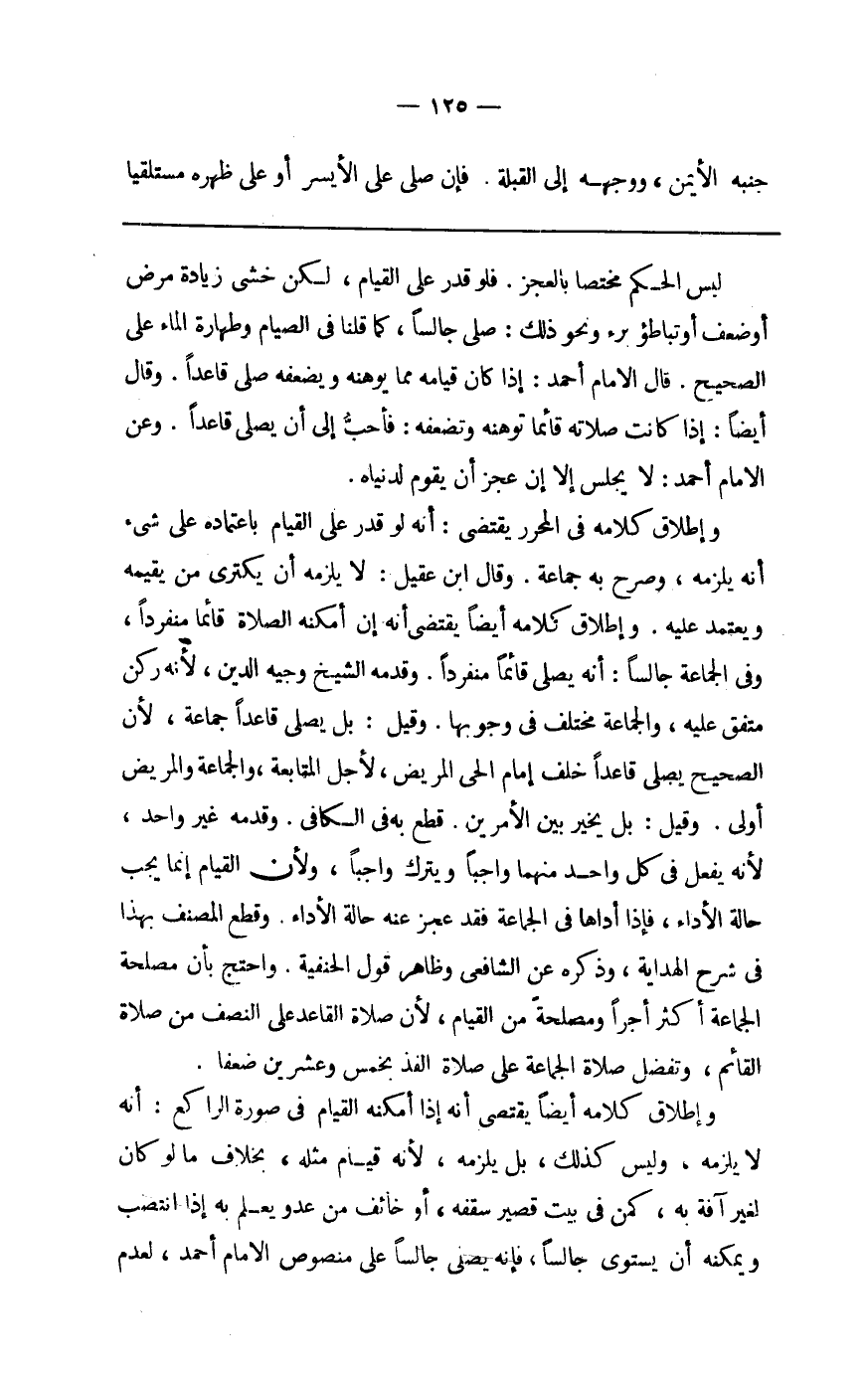 وَإِطْلَاق كَلَامه فِي الْمُحَرر يَقْتَضِي أَنه لَو قدر على الْقيام باعتماده على شَيْء أَنه يلْزمه وَصرح بِهِ جمَاعَة وَقَالَ ابْن عقيل لَا يلْزمه أَن يكتري من يقيمه ويعتمد عَلَيْهِ وَإِطْلَاق كَلَامه أَيْضا يَقْتَضِي أَنه إِن أمكنه الصَّلَاة قَائِما مُنْفَردا وَفِي الْجَمَاعَة جَالِسا أَنه يُصَلِّي قَائِما مُنْفَردا وَقدمه الشَّيْخ وجيه الدّين لِأَنَّهُ ركن مُتَّفق عَلَيْهِ وَالْجَمَاعَة مُخْتَلف فِي وُجُوبهَا وَقيل بل يُصَلِّي قَاعِدا جمَاعَة لِأَن الصَّحِيح يُصَلِّي قَاعِدا خلف إِمَام الْحَيّ الْمَرِيض لأجل الْمُتَابَعَة وَالْجَمَاعَة وَالْمَرِيض أولى وَقيل بل يُخَيّر بَين الْأَمريْنِ قطع بِهِ فِي الْكَافِي وَقدمه غير وَاحِد لِأَنَّهُ يفعل فِي كل وَاحِد مِنْهُمَا وَاجِبا وَيتْرك وَاجِبا وَلِأَن الْقيام إِنَّمَا يجب حَالَة الْأَدَاء فَإِذا أَدَّاهَا فِي الْجَمَاعَة فقد عجز عَنهُ حَالَة الْأَدَاء قطع المُصَنّف بِهَذَا فِي شرح الْهِدَايَة وَذكره عَن الشَّافِعِي وَظَاهر قَول الْحَنَفِيَّة وَاحْتج بِأَن مصلحَة الْجَمَاعَة أَكثر أجرا ومصلحة من الْقيام لِأَن صَلَاة الْقَاعِد على النّصْف من صَلَاة الْقَائِم وتفضل صَلَاة الْجَمَاعَة على صَلَاة الْفَذ بِخمْس وَعشْرين ضعفا