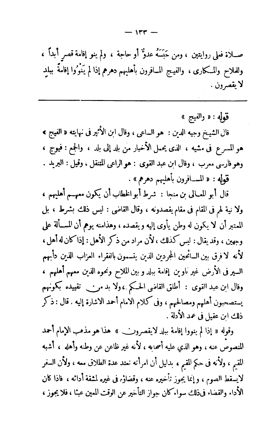 وَقَالَ أَبُو الْمَعَالِي بن منجا شَرط أَبُو الْخطاب أَن يكون مَعَهم أَهْليهمْ وَلَا نِيَّة لَهُم فِي الْمقَام فِي مقَام يقصدونه وَقَالَ القَاضِي لَيْسَ ذَلِك بِشَرْط بل الْمُعْتَبر أَن لَا يكون لَهُ وَطن يأوي إِلَيْهِ ويقصده وَهَذَا مِنْهُ يُوهم أَن الْمَسْأَلَة على وَجْهَيْن وَقد يُقَال لَيْسَ كَذَلِك لِأَن مُرَاد من ذكر الْأَهْل إِذا كَانَ لَهُ أهل لِأَنَّهُ لَا فرق بَين السائحين المجردين الَّذين يتسمون بالفقراء العزاب الَّذين دأبهم السّير فِي الأَرْض غير ناوين إِقَامَة بِبَلَد وَبَين الملاح وَنَحْوه الَّذين مَعَهم أهلهم وَقَالَ ابْن عبد الْقوي أطلق القَاضِي الحكم وَلَا بُد من تَقْيِيده بكونهم يستصحبون أهلهم ومصالحهم وَفِي كَلَام الإِمَام أَحْمد الْإِشَارَة إِلَيْهِ قَالَ ذكر ذَلِك ابْن عقيل فِي عمد الْأَدِلَّة