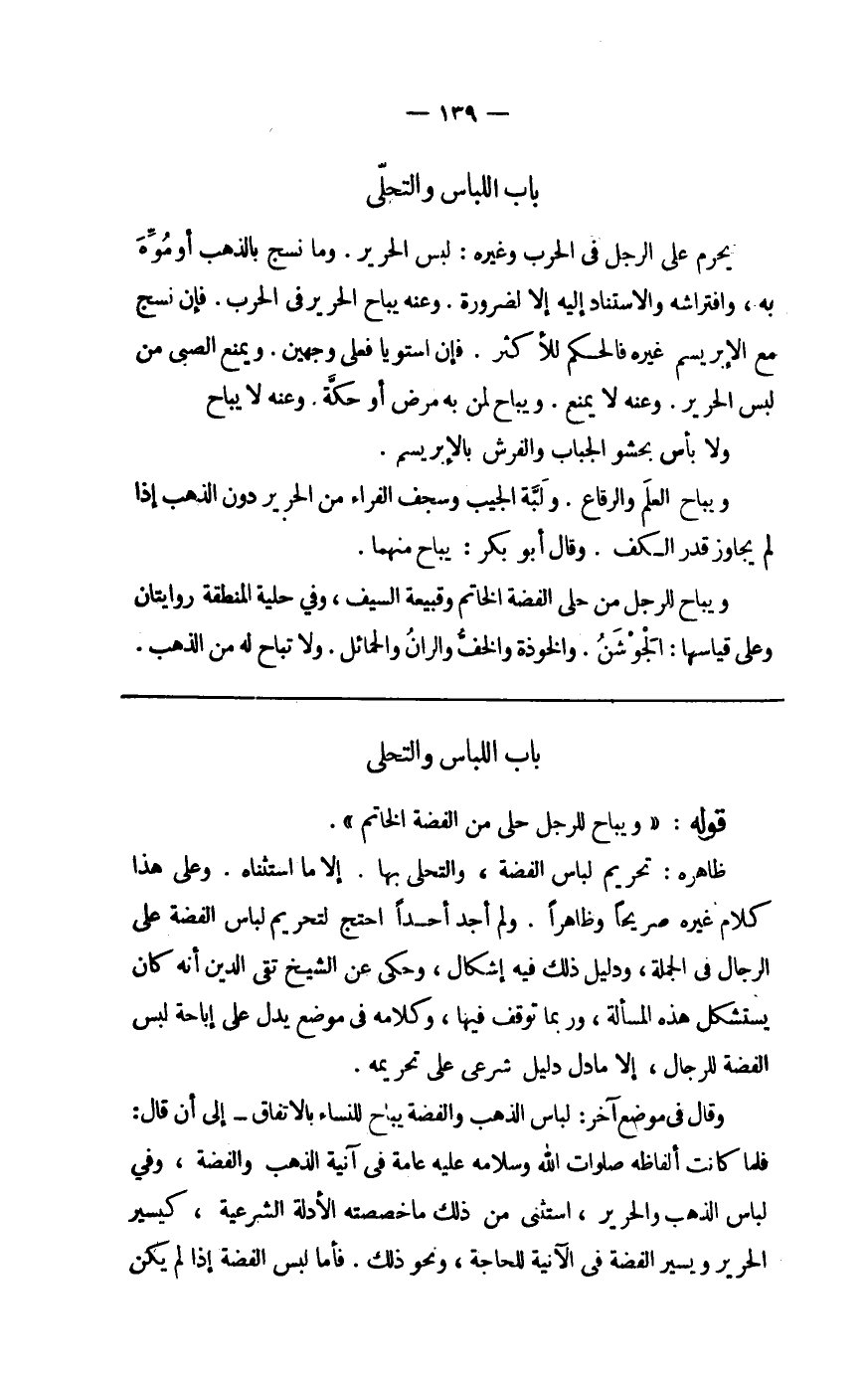 ظَاهره تَحْرِيم لِبَاس الْفضة والتحلي بهَا إِلَّا مَا اسْتَثْنَاهُ وعَلى هَذَا كَلَام غَيره صَرِيحًا وظاهرا وَلم أجد أحدا احْتج لتَحْرِيم لِبَاس الْفضة على الرِّجَال فِي الْجُمْلَة وَدَلِيل ذَلِك فِيهِ إِشْكَال وَحكى عَن الشَّيْخ تَقِيّ الدّين أَنه كَانَ يسْتَشْكل هَذِه الْمَسْأَلَة وَرُبمَا توقف فِيهَا وَكَلَامه فِي مَوضِع يدل على إِبَاحَة لبس الْفضة للرِّجَال إِلَّا مَا دلّ دَلِيل شَرْعِي على تَحْرِيمه