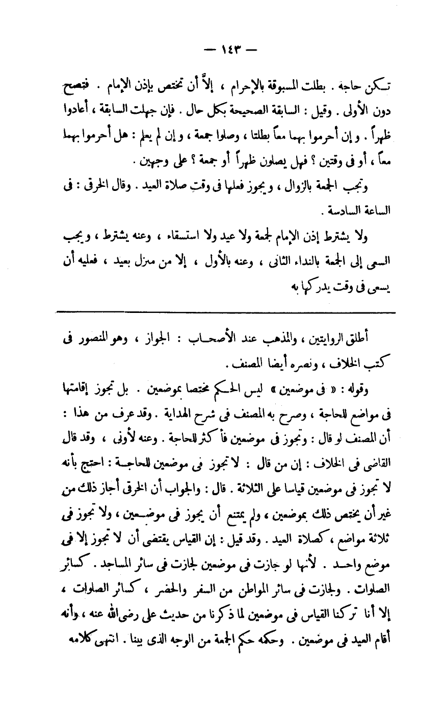 وَقَوله فِي موضِعين لَيْسَ الحكم مُخْتَصًّا بموضعين بل تجوز إِقَامَتهَا فِي مَوَاضِع للْحَاجة وَصرح بِهِ المُصَنّف فِي شرح الْهِدَايَة وَقد عرف من هَذَا أَن المُصَنّف لَو قَالَ وَتجوز فِي موضِعين فَأكْثر للْحَاجة وَعنهُ لأولى وَقد قَالَ القَاضِي فِي الْخلاف إِن من قَالَ لَا تجوز فِي موضِعين للْحَاجة احْتج بِأَنَّهُ لَا تجوز فِي موضِعين قِيَاسا على الثَّلَاثَة قَالَ وَالْجَوَاب أَن الْخرقِيّ أجَاز ذَلِك من غير أَن يخْتَص ذَلِك بموضعين وَلم يمْتَنع أَن يجوز فِي موضِعين وَلَا تجوز فِي ثَلَاثَة مَوَاضِع كَصَلَاة الْعِيد وَقد قيل إِن الْقيَاس يَقْتَضِي أَن لَا تجوز إِلَّا فِي مَوضِع وَاحِد لِأَنَّهَا لَو جَازَت فِي موضِعين لجازت فِي سَائِر الْمَسَاجِد كَسَائِر الصَّلَوَات ولجازت فِي سَائِر المواطن من السّفر والحضر كَسَائِر الصَّلَوَات إِلَّا أَنا تركنَا الْقيَاس فِي موضِعين لما ذكرنَا من حَدِيث عَليّ رَضِي الله عَنهُ وَأَنه أَقَامَ الْعِيد فِي موضِعين وَحكمه حكم الْجُمُعَة من الْوَجْه الَّذِي بَينا انْتهى كَلَامه
