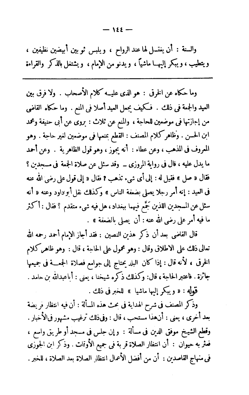 وَمَا حَكَاهُ عَن الْخرقِيّ هُوَ الَّذِي عَلَيْهِ كَلَام الْأَصْحَاب وَلَا فرق بَين الْعِيد وَالْجُمُعَة فِي ذَلِك فَكيف يَجْعَل الْعِيد أصلا فِي الْمَنْع وَمَا حَكَاهُ القَاضِي من إجازتها فِي موضِعين للْحَاجة وَالْمَنْع عَن ثَلَاث يرْوى عَن أبي حنيفَة وَمُحَمّد ابْن الْحسن وَظَاهر كَلَام المُصَنّف الْقطع بمنعها فِي موضِعين لغير حَاجَة وَهُوَ الْمَعْرُوف فِي الْمَذْهَب وَعَن عَطاء أَنه يجوز وَهُوَ قَول الظَّاهِرِيَّة وَعَن أَحْمد مَا يدل عَلَيْهِ قَالَ فِي رِوَايَة الْمروزِي وَقد سُئِلَ عَن صَلَاة الْجُمُعَة فِي مسجدين فَقَالَ صل فَقيل لَهُ إِلَى أَي شَيْء تذْهب فَقَالَ إِلَى قَول عَليّ رَضِي الله عَنهُ فِي الْعِيد إِنَّه أَمر رجلا يُصَلِّي بضعفه النَّاس وَكَذَلِكَ نقل أَبُو دَاوُد وَعنهُ أَنه سُئِلَ عَن المسجدين اللَّذين جمع فيهمَا بِبَغْدَاد هَل فِيهِ شَيْء مُتَقَدم فَقَالَ أَكثر مَا فِيهِ أَمر عَليّ رَضِي الله عَنهُ أَن يُصَلِّي بالضعفة
