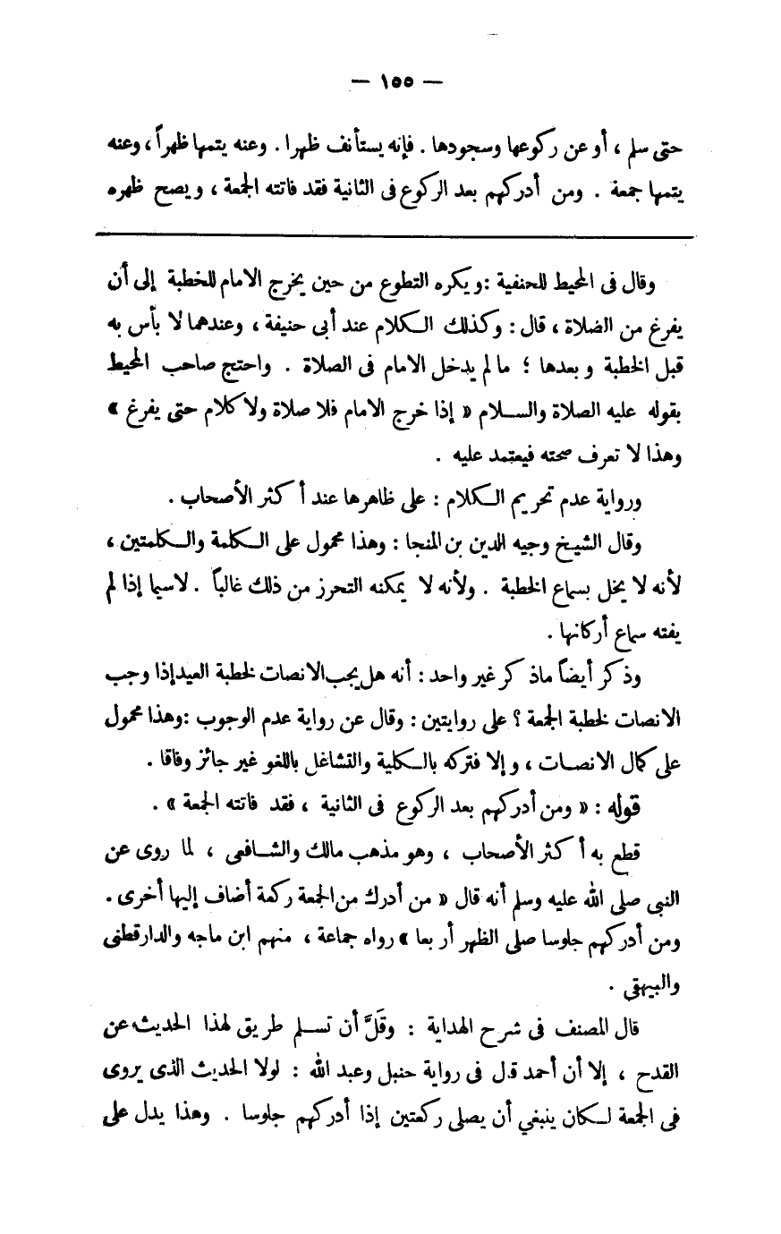 وَقَالَ فِي الْمُحِيط للحنفية وَيكرهُ التَّطَوُّع من حِين يخرج الامام للخطبة إِلَى أَن يفرغ من الصَّلَاة قَالَ وَكَذَلِكَ الْكَلَام عِنْد أبي حنيفَة وَعِنْدَهُمَا لَا بَأْس بِهِ قبل الْخطْبَة وَبعدهَا مالم يدْخل الامام فِي الصَّلَاة وَاحْتج صَاحب الْمُحِيط بقوله عَلَيْهِ الصَّلَاة وَالسَّلَام إِذا خرج الامام فَلَا صَلَاة وَلَا كَلَام حَتَّى يفرغ وَهَذَا لَا تعرف صِحَّته فيعتمد عَلَيْهِ