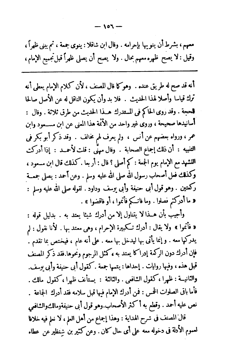 أَنه قد صَحَّ لَهُ طَرِيق عِنْده وَهُوَ كَمَا قَالَ المُصَنّف لِأَن كَلَام الإِمَام يعْطى أَنه ترك قِيَاسا وأصلا لهَذَا الحَدِيث فَلَا بُد وَأَن يكون النَّاقِل لَهُ عَن الأَصْل صَالحا للحجة وَقد روى الْحَاكِم فِي الْمُسْتَدْرك هَذَا الحَدِيث من طرق ثَلَاثَة وَقَالَ أسانيدها صَحِيحَة وروى غير وَاحِد من الْأَئِمَّة هَذَا الْمَعْنى عَن ابْن مَسْعُود وَابْن عمر وَرَوَاهُ بَعضهم عَن أنس وَلم يعرف لَهُم مُخَالف وَقد ذكر أَبُو بكر فِي التنبية أَن ذَلِك إِجْمَاع الصَّحَابَة وَقَالَ مهنى قلت لِأَحْمَد إِذا أدْركْت التَّشَهُّد مَعَ الإِمَام يَوْم الْجُمُعَة كم أُصَلِّي قَالَ أَرْبعا كَذَلِك قَالَ ابْن مَسْعُود وَكَذَلِكَ فعل أَصْحَاب رَسُول الله صلى الله عَلَيْهِ وَسلم وَعَن أَحْمد يُصَلِّي جُمُعَة رَكْعَتَيْنِ وَهُوَ قَول أبي حنيفَة وَأبي يُوسُف وَدَاوُد لقَوْله صلى الله عَلَيْهِ وَسلم مَا أدركتم فصلوا وَمَا فاتكم فَأتمُّوا أَو فاقضوا