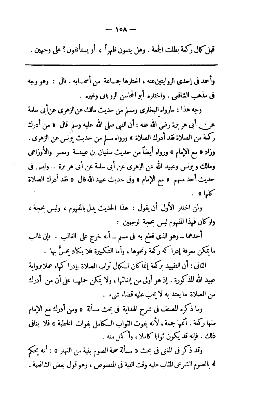 وَجه هَذَا مَا رَوَاهُ البُخَارِيّ وَمُسلم من حَدِيث مَالك عَن الزُّهْرِيّ عَن أبي سَلمَة عَن أبي هُرَيْرَة رَضِي الله عَنهُ أَن النَّبِي صلى الله عَلَيْهِ وَسلم قَالَ من أدْرك رَكْعَة من الصَّلَاة فقد أدْرك الصَّلَاة وَرَوَاهُ مُسلم من حَدِيث يُونُس عَن الزُّهْرِيّ وَزَاد مَعَ الإِمَام وَرَوَاهُ أَيْضا من حَدِيث سُفْيَان بن عُيَيْنَة وَمعمر وَالْأَوْزَاعِيّ وَمَالك وَيُونُس وَعبيد الله عَن الزُّهْرِيّ عَن أبي سَلمَة عَن أبي هُرَيْرَة وَلَيْسَ فِي حَدِيث أحد مِنْهُم مَعَ الإِمَام وَفِي حَدِيث عبيد الله قَالَ فقد أدْرك الصَّلَاة كلهَا