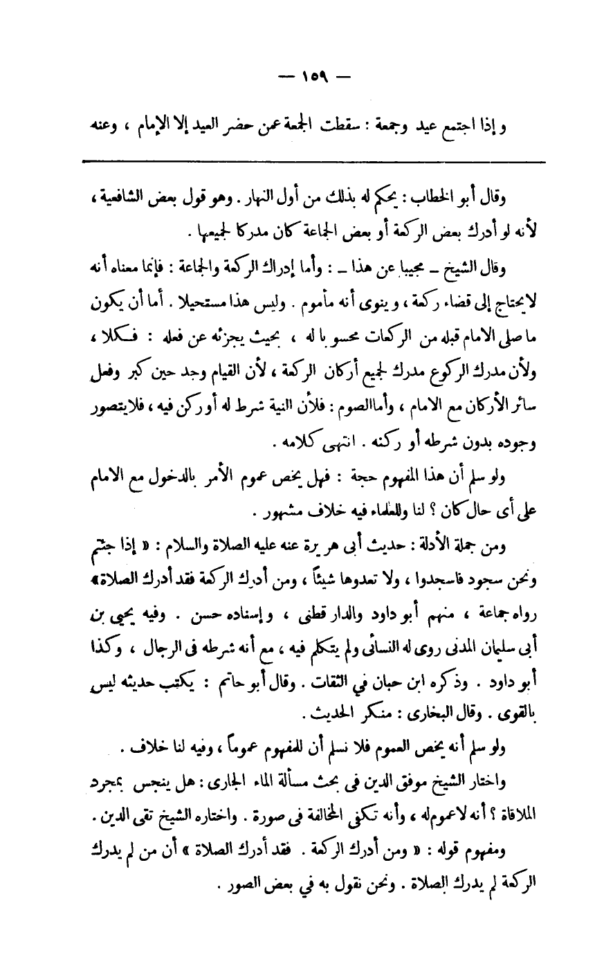 وَمن جملَة الْأَدِلَّة حَدِيث أبي هُرَيْرَة عَنهُ عَلَيْهِ الصَّلَاة وَالسَّلَام إِذا جئْتُمْ وَنحن سُجُود فاسجدوا وَلَا تعدوها شَيْئا وَمن أدْرك الرَّكْعَة فقد أدْرك الصَّلَاة رَوَاهُ جمَاعَة مِنْهُم أَبُو دَاوُد وَالدَّارَقُطْنِيّ وَإِسْنَاده حسن وَفِيه يحيى بن أبي سُلَيْمَان الْمدنِي روى لَهُ النَّسَائِيّ وَلم يتَكَلَّم فِيهِ مَعَ أَنه شَرطه فِي الرِّجَال وَكَذَا أَبُو دَاوُد وَذكره ابْن حبَان فِي الثِّقَات وَقَالَ أَبُو حَاتِم يكْتب حَدِيثه لَيْسَ بِالْقَوِيّ وَقَالَ البُخَارِيّ مُنكر الحَدِيث