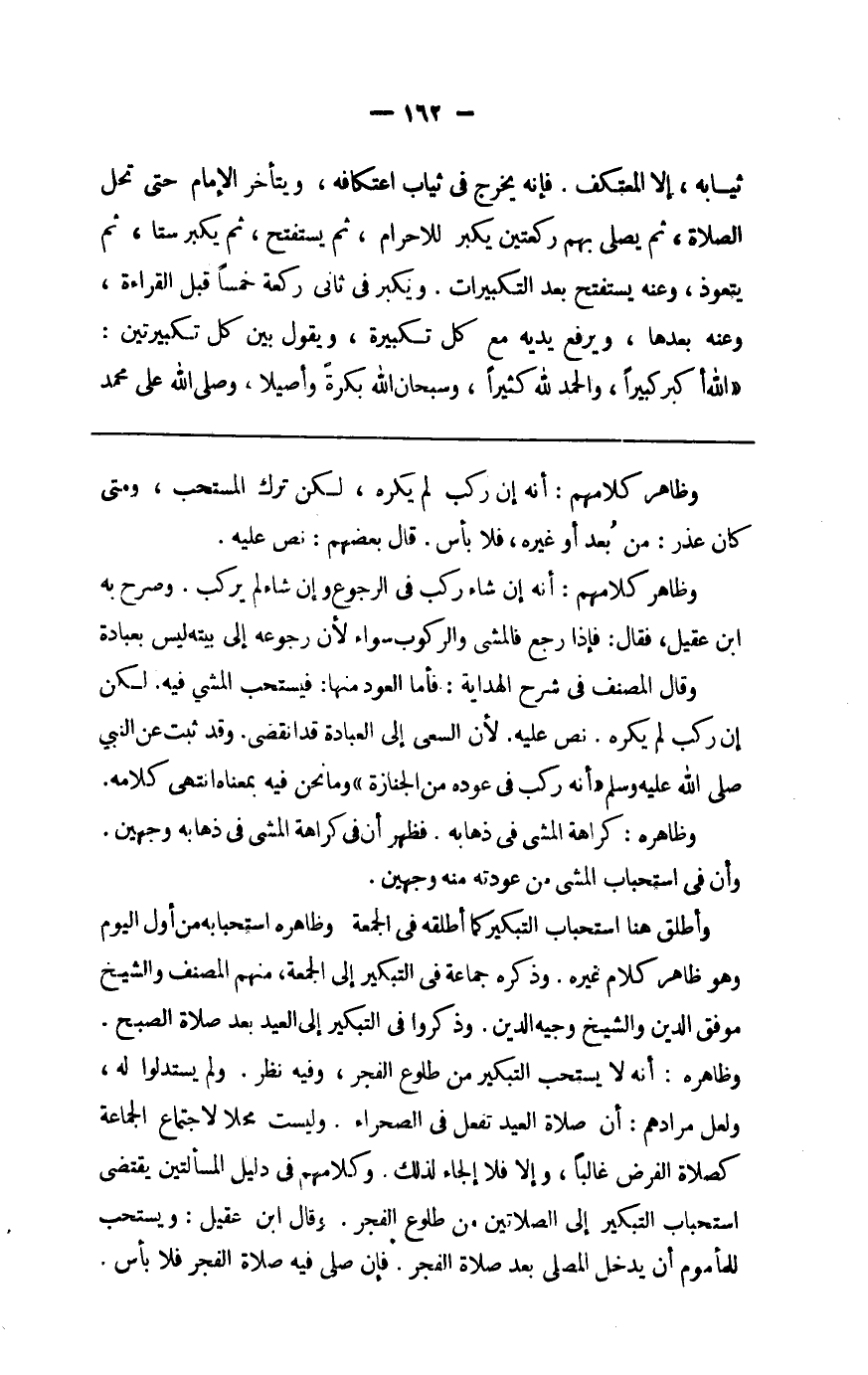 وَأطلق هُنَا اسْتِحْبَاب التبكير كَمَا أطلقهُ فِي الْجُمُعَة وَظَاهره اسْتِحْبَابه من أول الْيَوْم وَهُوَ ظَاهر كَلَام غَيره وَذكره جمَاعَة فِي التبكير إِلَى الْجُمُعَة مِنْهُم المُصَنّف وَالشَّيْخ موفق الدّين وَالشَّيْخ وجيه الدّين وَذكروا فِي التبكير إِلَى الْعِيد بعد صَلَاة الصُّبْح وَظَاهره أَنه لَا يسْتَحبّ التبكير من طُلُوع الْفجْر وَفِيه نظر وَلم يستدلوا لَهُ وَلَعَلَّ مُرَادهم أَن صَلَاة الْعِيد تفعل فِي الصَّحرَاء وَلَيْسَت محلا لِاجْتِمَاع الْجَمَاعَة كَصَلَاة الْفَرْض غَالِبا وَإِلَّا فَلَا إلجاء لذَلِك وَكَلَامهم فِي دَلِيل الْمَسْأَلَتَيْنِ يَقْتَضِي اسْتِحْبَاب التبكير إِلَى الصَّلَاتَيْنِ من طُلُوع الْفجْر وَقَالَ ابْن عقيل وَيسْتَحب للْمَأْمُوم أَن يدْخل الْمصلى بعد صَلَاة الْفجْر فَإِن صلى فِيهِ صَلَاة الْفجْر فَلَا بَأْس