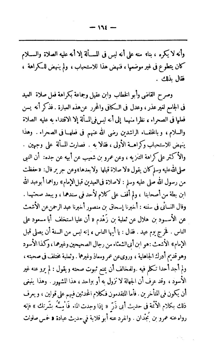 وَصرح القَاضِي وَأَبُو الْخطاب وَابْن عقيل وَجَمَاعَة بِكَرَاهَة فعل صَلَاة الْعِيد فِي الْجَامِع لغير عذر وَعدل فِي الْكَافِي وَالْمُحَرر عَن هَذَا الْعبارَة فَذكر أَنه يسن فعلهَا فِي الصَّحرَاء نظرا مِنْهُمَا إِلَى أَنه لَيْسَ فِي الْمَسْأَلَة إِلَّا الِاقْتِدَاء بِهِ عَلَيْهِ الصَّلَاة وَالسَّلَام وبالخلفاء الرَّاشِدين رَضِي الله عَنْهُم فِي فعلهَا فِي الصَّحرَاء وَهَذَا ينْهض للاستحباب وَكَرَاهَة الأولى فَقَالَا بِهِ فَصَارَت الْمَسْأَلَة على وَجْهَيْن وَالْأَكْثَر على كَرَاهَة التَّنْزِيه وَعَن عَمْرو بن شُعَيْب عَن أَبِيه عَن جده أَن النَّبِي صلى الله عَلَيْهِ وَسلم كَانَ يَقُول لَا صَلَاة قبلهَا وَلَا بعْدهَا وَعَن جرير قَالَ حفظت من رَسُول الله صلى الله عَلَيْهِ وَسلم لَا صَلَاة فِي الْعِيدَيْنِ قبل الإِمَام رَوَاهُمَا أَبُو عبد الله ابْن بطة من أَصْحَابنَا وَلم أَقف على كَلَام لأحد فِي سندهما وَيبعد صحتهما وَقَالَ النَّسَائِيّ فِي سنَنه أخبرنَا إِسْحَاق بن مَنْصُور أخبرنَا عبد الرَّحْمَن عَن الْأَشْعَث عَن الْأسود بن هِلَال عَن ثَعْلَبَة بن زَهْدَم أَن عليا اسْتخْلف أَبَا مَسْعُود على النَّاس فَخرج يَوْم عيد فَقَالَ يَا أَيهَا النَّاس إِنَّه لَيْسَ من السّنة أَن يُصَلِّي قبل الإِمَام الْأَشْعَث هُوَ ابْن أبي الشعْثَاء من رجال الصَّحِيحَيْنِ وَغَيرهمَا وَكَذَا الْأسود وَهُوَ قديم أدْرك الْجَاهِلِيَّة وَرُوِيَ عَن عمر ومعاذ وَغَيرهمَا وثعلبة مُخْتَلف فِي صحبته وَلم أجد أحدا تكلم فِيهِ وللمخالف أَن يمْنَع ثُبُوت صِحَّته وَيَقُول لم يرو عَنهُ غير الْأسود وَقد عرف أَن الْجَهَالَة لَا تَزُول بِهِ أَو بِوَاحِد هَذَا الْمَشْهُور وَهَذَا يَنْبَغِي أَن يكون فِي الْمُتَأَخِّرين فَأَما المتقدمون فَكَلَام الْمُحدثين فيهم على قَوْلَيْنِ وَيعرف ذَلِك بِكَلَام الْأَئِمَّة فِي حَدِيث أبي ذَر إِذا وجدت المَاء فأمسه بشرتك فَإِنَّهُ رَوَاهُ عَنهُ عَمْرو بن بجدان وَانْفَرَدَ عَنهُ أَبُو قلَابَة فِي حَدِيث عبَادَة خمس صلوَات