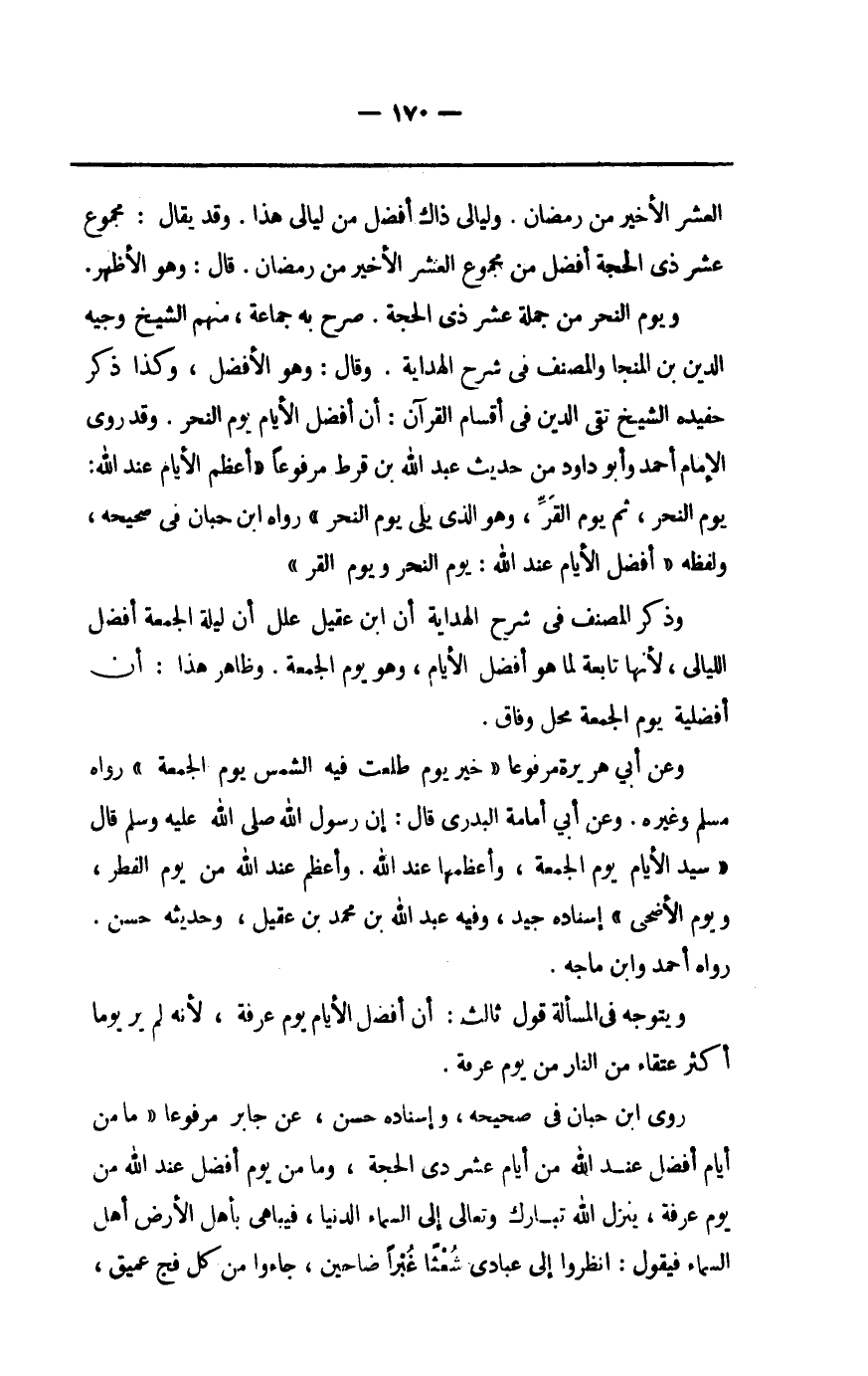 روى ابْن حبَان فِي صَحِيحه وَإِسْنَاده حسن عَن جَابر مَرْفُوعا مَا من أَيَّام أفضل عِنْد الله من أَيَّام عشر ذِي الْحجَّة وَمَا من يَوْم أفضل عِنْد الله من يَوْم عَرَفَة ينزل الله تبَارك وَتَعَالَى إِلَى السَّمَاء الدُّنْيَا فيباهي بِأَهْل الأَرْض أهل السَّمَاء فَيَقُول انْظُرُوا إِلَى عبَادي شعثا غبرا ضاحين جَاءُوا من كل فج عميق