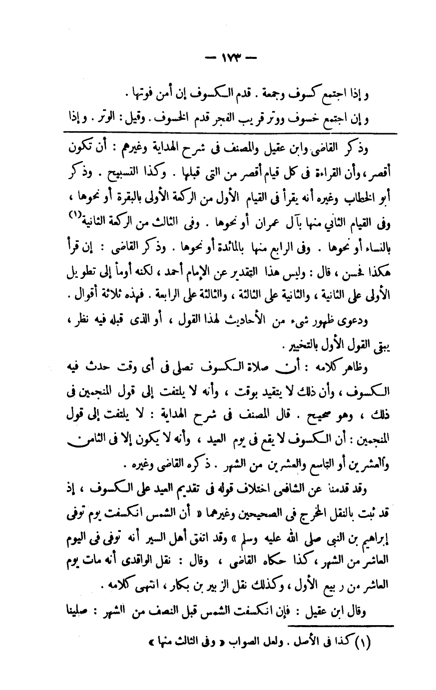 وَظَاهر كَلَامه أَن صَلَاة الْكُسُوف تصلى فِي أَي وَقت حدث فِيهِ الْكُسُوف وَأَن ذَلِك لَا يتَقَيَّد بِوَقْت وَأَنه لَا يلْتَفت إِلَى قَول المنجمين فِي ذَلِك وَهُوَ صَحِيح قَالَ المُصَنّف فِي شرح الْهِدَايَة لَا يلْتَفت إِلَى قَول المنجمين أَن الْكُسُوف لَا يَقع فِي يَوْم الْعِيد وَأَنه لَا يكون إِلَّا فِي الثَّامِن وَالْعِشْرين أَو التَّاسِع وَالْعِشْرين من الشَّهْر ذكره القَاضِي وَغَيره