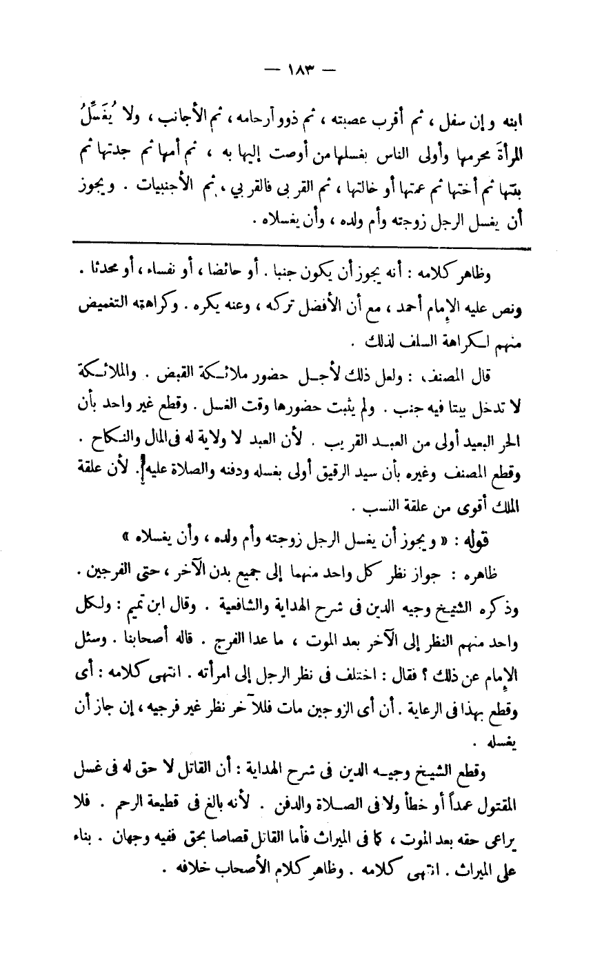 ظَاهره جَوَاز نظر كل وَاحِد مِنْهُمَا إِلَى جَمِيع بدن الآخر حَتَّى الفرجين وَذكره الشَّيْخ وجيه الدّين فِي شرح الْهِدَايَة وَالشَّافِعِيَّة وَقَالَ ابْن تَمِيم وَلكُل وَاحِد مِنْهُم النّظر إِلَى الآخر بعد الْمَوْت مَا عدا الْفرج قَالَه أَصْحَابنَا وَسُئِلَ الإِمَام عَن ذَلِك فَقَالَ اخْتلف فِي نظر الرجل إِلَى امْرَأَته انْتهى كَلَامه أَي وَقطع بِهَذَا فِي الرِّعَايَة أَن أَي الزَّوْجَيْنِ مَاتَ فللآخر نظر غير فرجيه إِن جَازَ أَن يغسلهُ