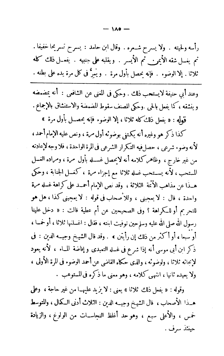 وَقَوله يفعل ذَلِك ثَلَاثًا يَعْنِي لَا يزِيد عَلَيْهَا من غير حَاجَة وعَلى هَذَا الْأَصْحَاب قَالَ الشَّيْخ وجيه الدّين الثَّلَاث أدنى الْكَمَال والمتوسط خمس والأعلى سبع وَهُوَ حد اغلظ النَّجَاسَات من الولوغ وَالزِّيَادَة حِينَئِذٍ سرف