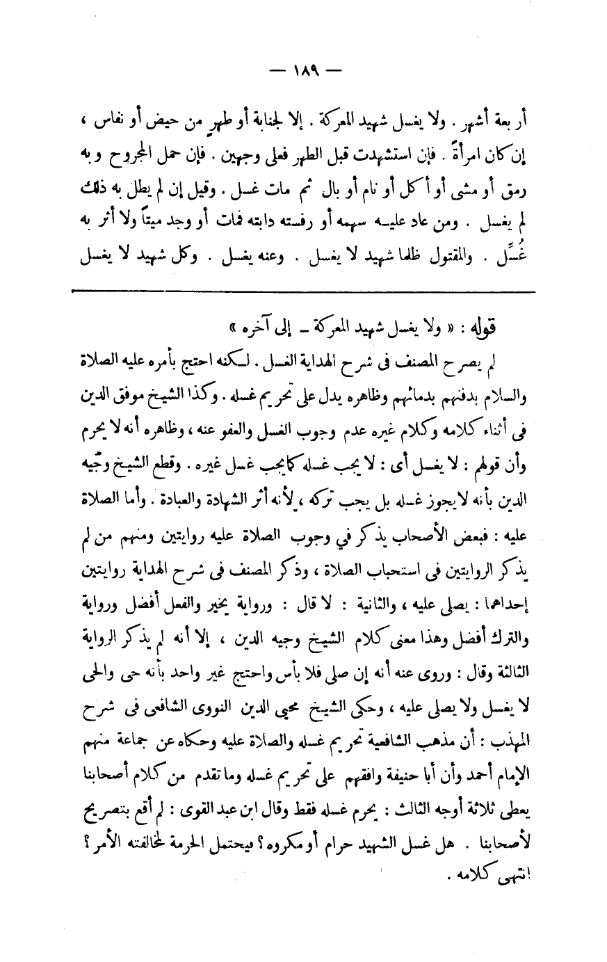لم يُصَرح المُصَنّف فِي شرح الْهِدَايَة الْغسْل لكنه احْتج بأَمْره عَلَيْهِ الصَّلَاة وَالسَّلَام بدفنهم بدمائهم وَظَاهره يدل على تَحْرِيم غسله وَكَذَا الشَّيْخ موفق الدّين فِي أثْنَاء كَلَامه وَكَلَام غَيره عدم وجوب الْغسْل وَالْعَفو عَنهُ وَظَاهره أَنه لَا يحرم وَأَن قَوْلهم لَا يغسل أَي لَا يجب غسله كَمَا يجب غسل غَيره وَقطع الشَّيْخ وجيه الدّين بِأَنَّهُ لَا يجوز غسله بل يجب تَركه لِأَنَّهُ أثر الشَّهَادَة وَالْعِبَادَة وَأما الصَّلَاة عَلَيْهِ فبعض الْأَصْحَاب يذكر فِي وجوب الصَّلَاة عَلَيْهِ رِوَايَتَيْنِ وَمِنْهُم من لم يذكر الرِّوَايَتَيْنِ فِي اسْتِحْبَاب الصَّلَاة وَذكر المُصَنّف فِي شرح الْهِدَايَة رِوَايَتَيْنِ إِحْدَاهمَا يصلى عَلَيْهِ وَالثَّانيَِة لَا قَالَ وَرِوَايَة يُخَيّر وَالْفِعْل أفضل وَرِوَايَة وَالتّرْك أفضل وَهَذَا معنى كَلَام الشَّيْخ وجيه الدّين إِلَّا أَنه لم يذكر الرِّوَايَة الثَّالِثَة وَقَالَ وروى عَنهُ أَنه إِن صلى فَلَا بَأْس وَاحْتج غير وَاحِد بِأَنَّهُ حَيّ والحي لَا يغسل وَلَا يصلى عَلَيْهِ وَحكى الشَّيْخ محيي الدّين النَّوَوِيّ الشَّافِعِي فِي شرح الْمُهَذّب أَن مَذْهَب الشَّافِعِيَّة تَحْرِيم غسله وَالصَّلَاة عَلَيْهِ وَحَكَاهُ عَن جمَاعَة مِنْهُم الإِمَام أَحْمد وَأَن أَبَا حنيفَة وافقهم على تَحْرِيم غسله وَمَا تقدم من كَلَام أَصْحَابنَا يُعْطي ثَلَاثَة أوجه الثَّالِث يحرم غسله فَقَط وَقَالَ ابْن عبد الْقوي لم أقع بتصريح لِأَصْحَابِنَا هَل غسل الشَّهِيد حرَام أَو مَكْرُوه فَيحْتَمل الْحُرْمَة لمُخَالفَته الْأَمر انْتهى كَلَامه