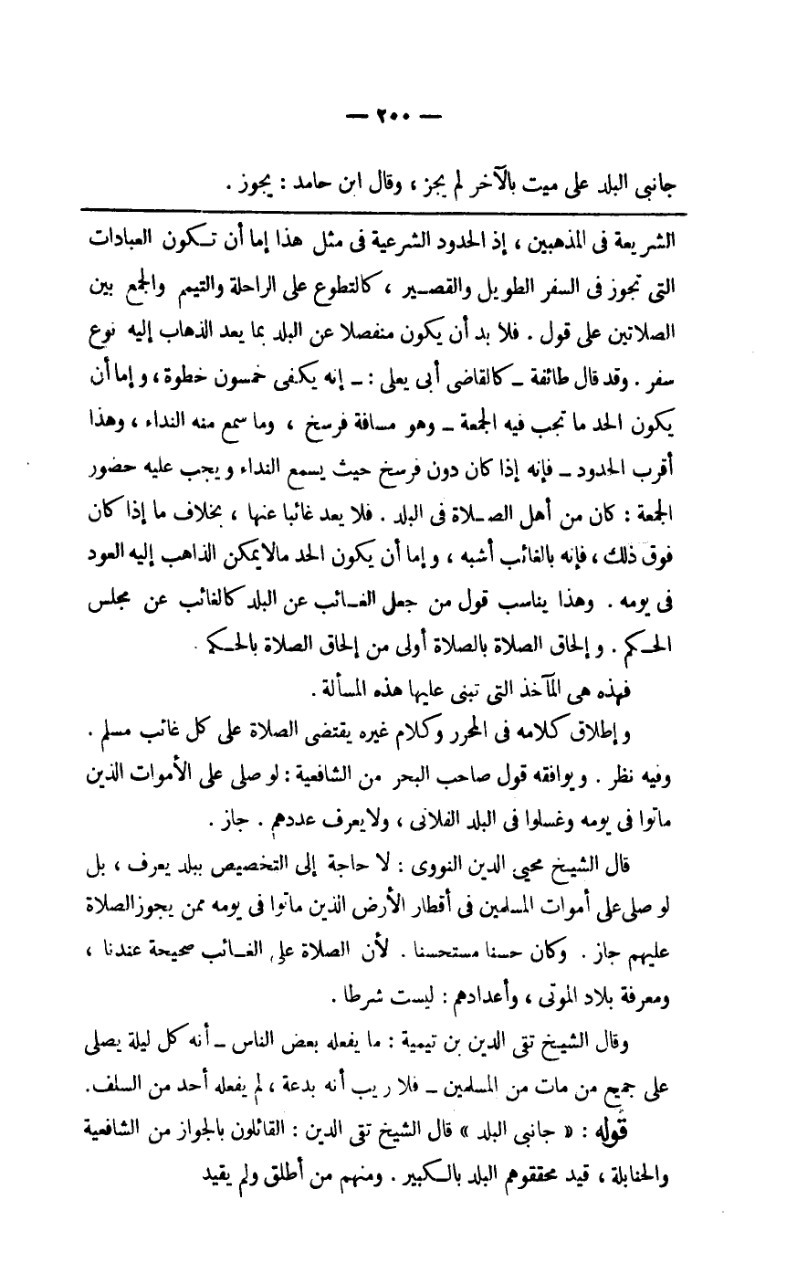 الشَّرِيعَة فِي المذهبين إِذْ الْحُدُود الشَّرْعِيَّة فِي مثل هَذَا إِمَّا أَن تكون الْعِبَادَات الَّتِي تجوز فِي السّفر الطَّوِيل والقصير كالتطوع على الرَّاحِلَة وَالتَّيَمُّم وَالْجمع بَين الصَّلَاتَيْنِ على قَول فَلَا بُد أَن يكون مُنْفَصِلا عَن الْبَلَد بِمَا يعد الذّهاب إِلَيْهِ نوع سفر وَقد قَالَ طَائِفَة كَالْقَاضِي أبي يعلى إِنَّه يَكْفِي خَمْسُونَ خطْوَة وَإِمَّا أَن يكون الْحَد مَا تجب فِيهِ الْجُمُعَة وَهُوَ مَسَافَة فَرسَخ وَمَا سمع مِنْهُ النداء وَهَذَا أقرب الْحُدُود فَإِنَّهُ إِذا كَانَ دون فَرسَخ حَيْثُ يسمع النداء وَيجب عَلَيْهِ حُضُور الْجُمُعَة كَانَ من أهل الصَّلَاة فِي الْبَلَد فَلَا يعد غَائِبا عَنْهَا بِخِلَاف مَا إِذا كَانَ فَوق ذَلِك فَإِنَّهُ بالغائب أشبه وَإِمَّا أَن يكون الْحَد مَا لَا يُمكن الذَّاهِب إِلَيْهِ الْعود فِي يَوْمه وَهَذَا يُنَاسب قَول من جعل الْغَائِب عَن الْبَلَد كالغائب عَن مجْلِس الحكم وإلحاق الصَّلَاة بِالصَّلَاةِ أولى من إِلْحَاق الصَّلَاة بالحكم