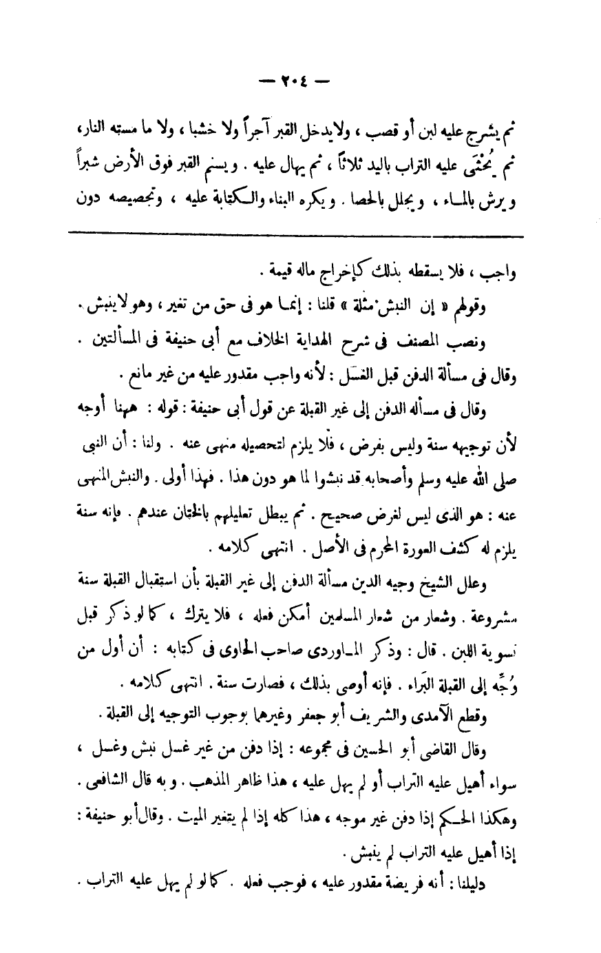 وَقَالَ فِي مَسْأَلَة الدّفن إِلَى غير الْقبْلَة عَن قَول أبي حنيفَة قَوْله هَهُنَا أوجه لِأَن تَوْجِيهه سنة وَلَيْسَ بِفَرْض فَلَا يلْزم لتحصيله مَنْهِيّ عَنهُ وَلنَا أَن النَّبِي صلى الله عَلَيْهِ وَسلم وَأَصْحَابه قد نبشوا لما هُوَ دون هَذَا فَهَذَا أولى والنبش الْمنْهِي عَنهُ هُوَ الَّذِي لَيْسَ لغَرَض صَحِيح ثمَّ يبطل تَعْلِيلهم بالختان عِنْدهم فَإِنَّهُ سنة يلْزم لَهُ كشف الْعَوْرَة الْمحرم فِي الأَصْل انْتهى كَلَامه