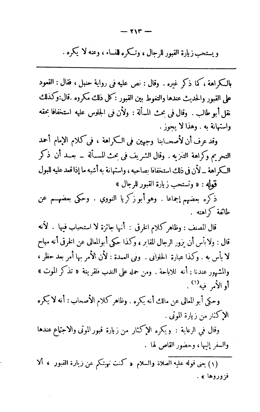 وَحكى أَبُو الْمَعَالِي عَن مَالك أَنه يكره وَظَاهر كَلَام الْأَصْحَاب أَنه لَا يكره الْإِكْثَار من زِيَارَة الْمَوْتَى