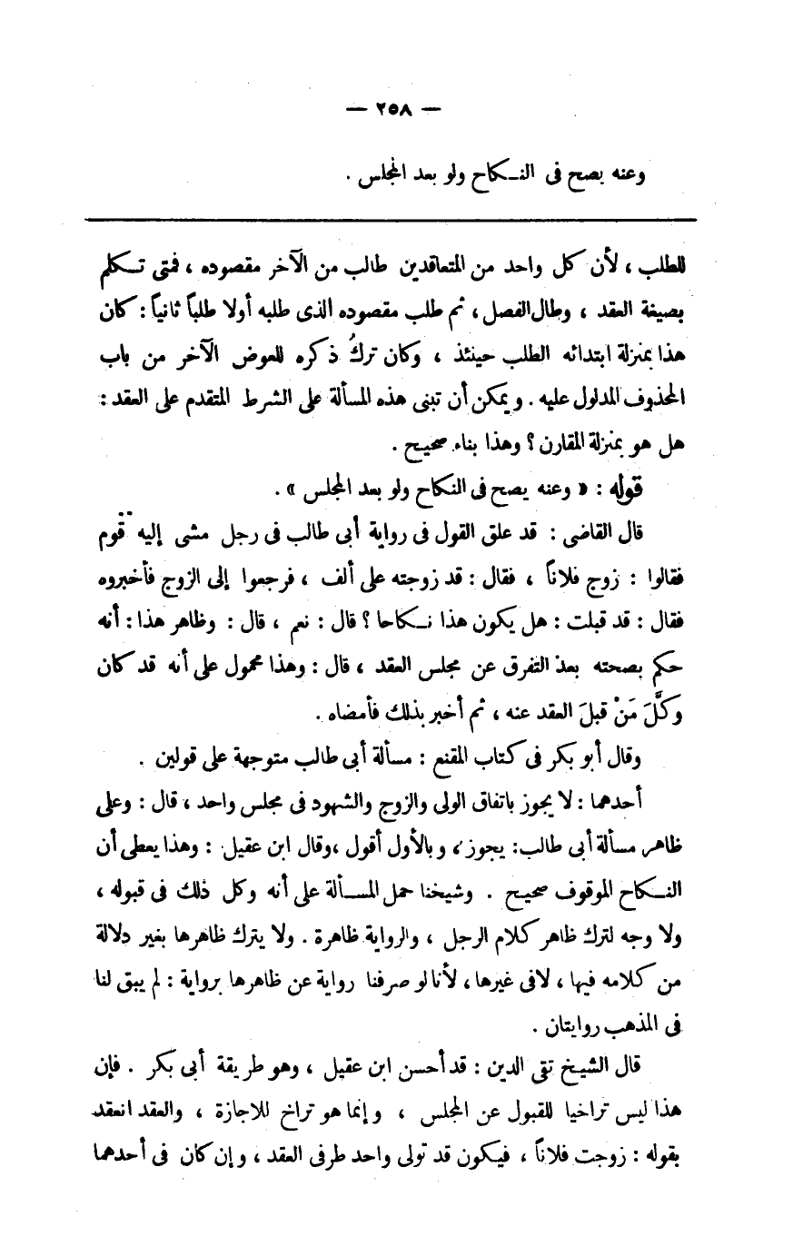 قَالَ الشَّيْخ تَقِيّ الدّين قد أحسن ابْن عقيل وَهُوَ طَريقَة أبي بكر فَإِن هَذَا لَيْسَ تراخيا للقبول عَن الْمجْلس وَإِنَّمَا هُوَ تراخ للاجازة وَالْعقد انْعَقَد بقوله زوجت فلَانا فَيكون قد تولى وَاحِد طرفِي العقد وَإِن كَانَ فِي أَحدهمَا