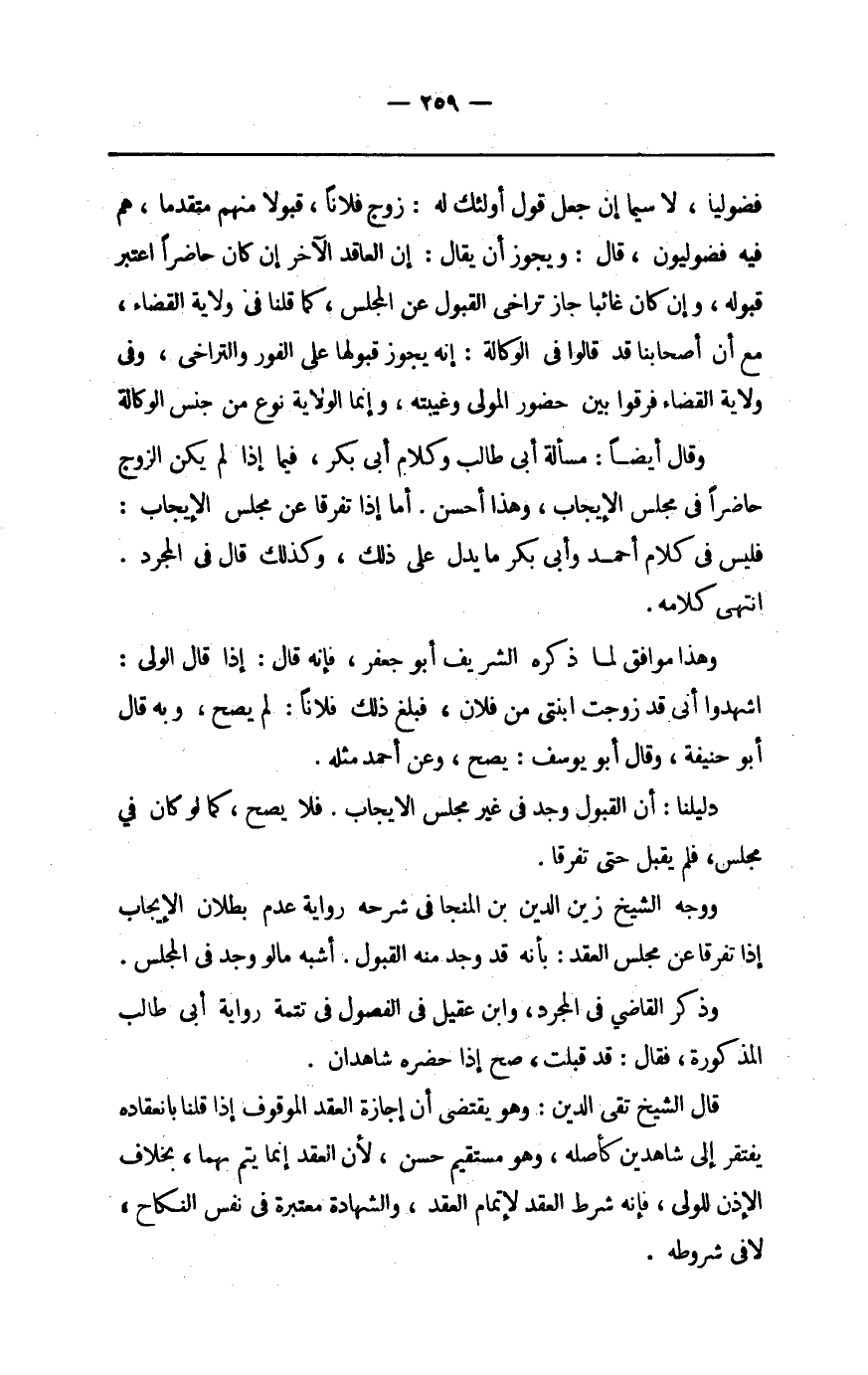 فضوليا لَا سِيمَا إِن جعل قَول أُولَئِكَ لَهُ زوج فلَانا قبولا مِنْهُم مُتَقَدما هم فِيهِ فضوليون قَالَ وَيجوز أَن يُقَال إِن الْعَاقِد الآخر إِن كَانَ حَاضرا اعْتبر قبُوله وَإِن كَانَ غَائِبا جَازَ تراخي الْقبُول عَن الْمجْلس كَمَا قُلْنَا فِي ولَايَة الْقَضَاء مَعَ أَن أَصْحَابنَا قد قَالُوا فِي الْوكَالَة إِنَّه يجوز قبُولهَا على الْفَوْر والتراخي وَفِي ولَايَة الْقَضَاء فرقوا بَين حُضُور الْمولى وغيبته وَإِنَّمَا الْولَايَة نوع من جنس الْوكَالَة