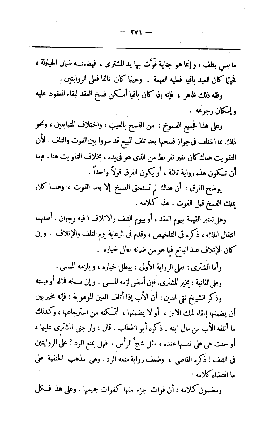 وعَلى هَذَا فَجَمِيع الفسوخ من الْفَسْخ بِالْعَيْبِ وَاخْتِلَاف الْمُتَبَايعين وَنَحْو ذَلِك مِمَّا اخْتلف فِي جَوَاز فَسخهَا بعد تلف الْمَبِيع قد سووا بَين الْفَوْت والتلف لِأَن التفويت هُنَاكَ كَانَ بِغَيْر تَفْرِيط من الَّذِي هُوَ فِي يَده بِخِلَاف التفويت هُنَا فإمَّا أَن تكون هَذِه رِوَايَة ثَالِثَة أَو يكون الْفرق قولا وَاحِدًا