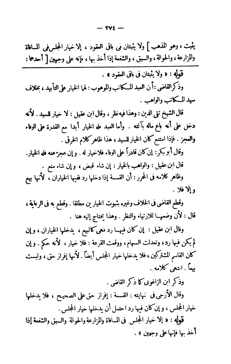 قَوْله إِلَّا خِيَار الْمجْلس فِي الْمُسَاقَاة والمزارعة وَالْحوالَة والسبق وَالشُّفْعَة إِذا أَخذ بهَا فَإِنَّهَا على وَجْهَيْن