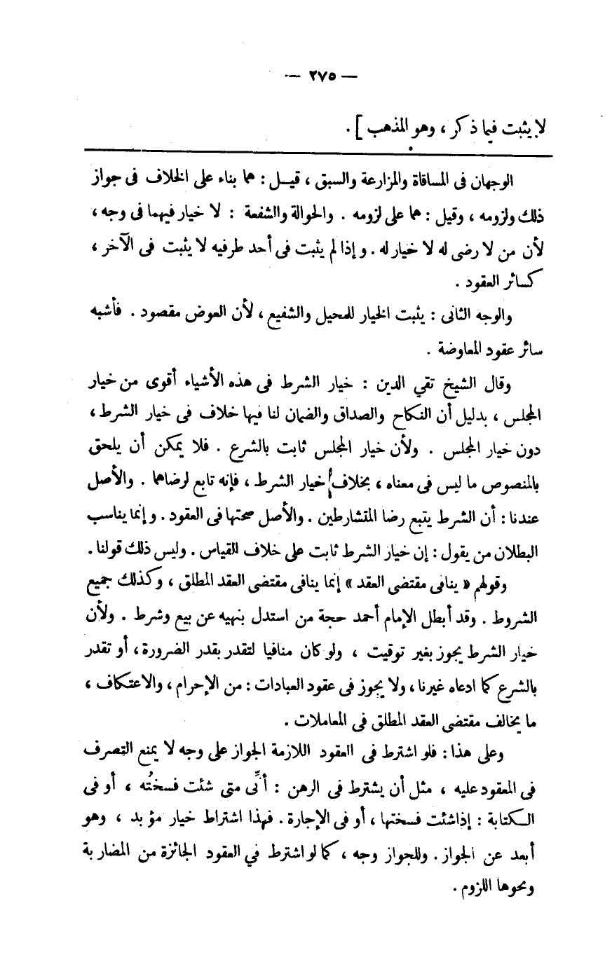 وَقَوْلهمْ يُنَافِي مُقْتَضى العقد إِنَّمَا يُنَافِي مُقْتَضى العقد الْمُطلق وَكَذَلِكَ جَمِيع الشُّرُوط وَقد أبطل الإِمَام أَحْمد حجَّة من اسْتدلَّ بنهيه عَن بيع وَشرط وَلِأَن خِيَار الشَّرْط يجوز بِغَيْر تَوْقِيت وَلَو كَانَ منافيا لتقدر بِقدر الضَّرُورَة أَو تقدر بِالشَّرْعِ كَمَا ادَّعَاهُ غَيرنَا وَلَا يجوز فِي عُقُود الْعِبَادَات من الْإِحْرَام وَالِاعْتِكَاف مَا يُخَالف مُقْتَضى العقد الْمُطلق فِي الْمُعَامَلَات