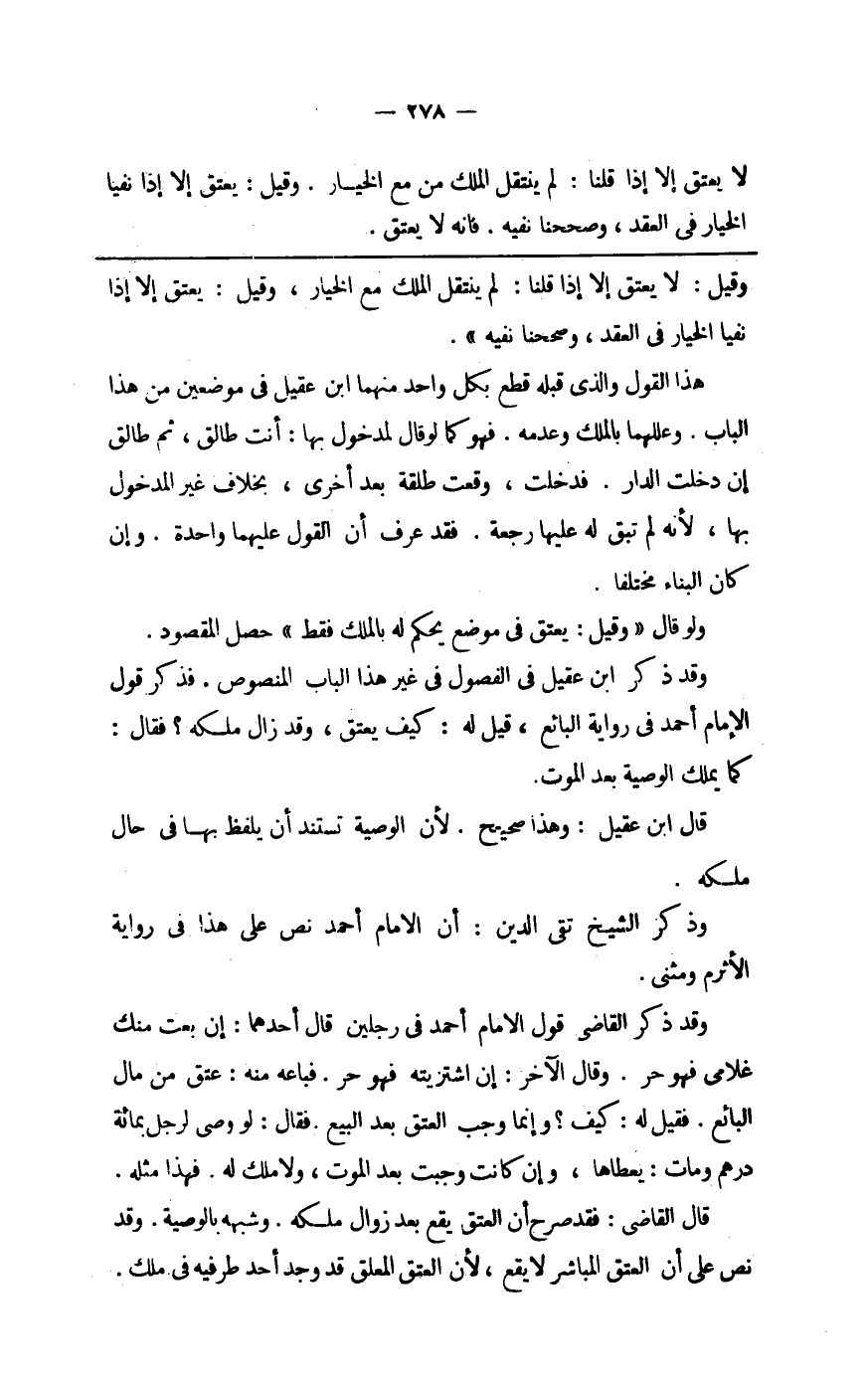 وَقد ذكر ابْن عقيل فِي الْفُصُول فِي غير هَذَا الْبَاب الْمَنْصُوص فَذكر قَول الإِمَام أَحْمد فِي رِوَايَة البَائِع قيل لَهُ كَيفَ يعْتق وَقد زَالَ ملكه فَقَالَ كَمَا يملك الْوَصِيَّة بعد الْمَوْت