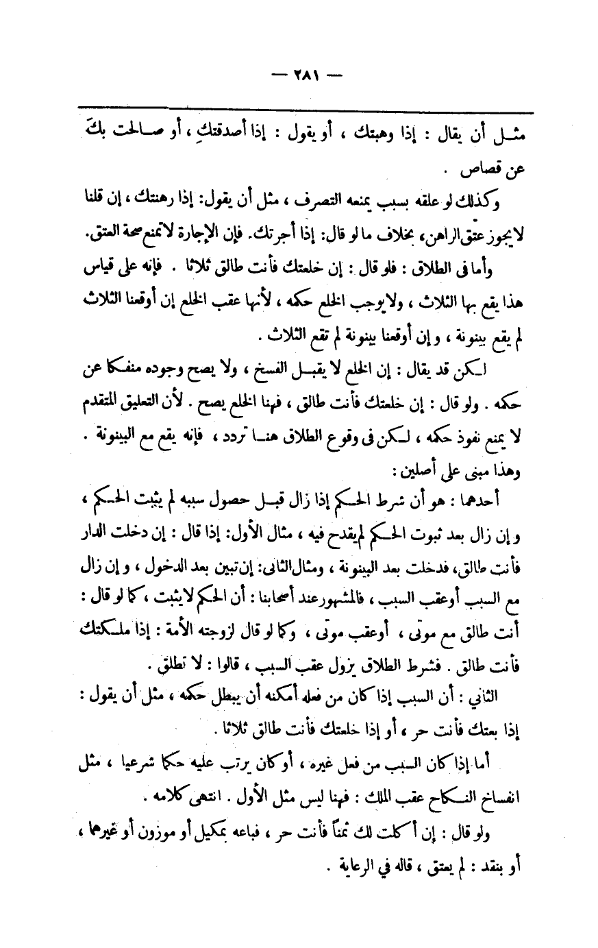 أَحدهمَا هُوَ أَن شَرط الحكم إِذا زَالَ قبل حُصُول سَببه لم يثبت الحكم وَإِن زَالَ بعد ثُبُوت الحكم لم يقْدَح فِيهِ مِثَال الأول إِذا قَالَ إِن دخلت الدَّار فَأَنت طَالِق فَدخلت بعد الْبَيْنُونَة وَمِثَال الثَّانِي إِن تبين بعد الدُّخُول وَإِن مَا زَالَ مَعَ السَّبَب أَو عقب السَّبَب فَالْمَشْهُور عِنْد أَصْحَابنَا أَن الحكم لَا يثبت كَمَا لَو قَالَ أَنْت طَالِق مَعَ موتِي أَو عقب موتِي وكما لَو قَالَ لزوجته الْأمة إِذا مَلكتك فَأَنت طَالِق فَشرط الطَّلَاق يَزُول عقب السَّبَب قَالُوا لَا تطلق