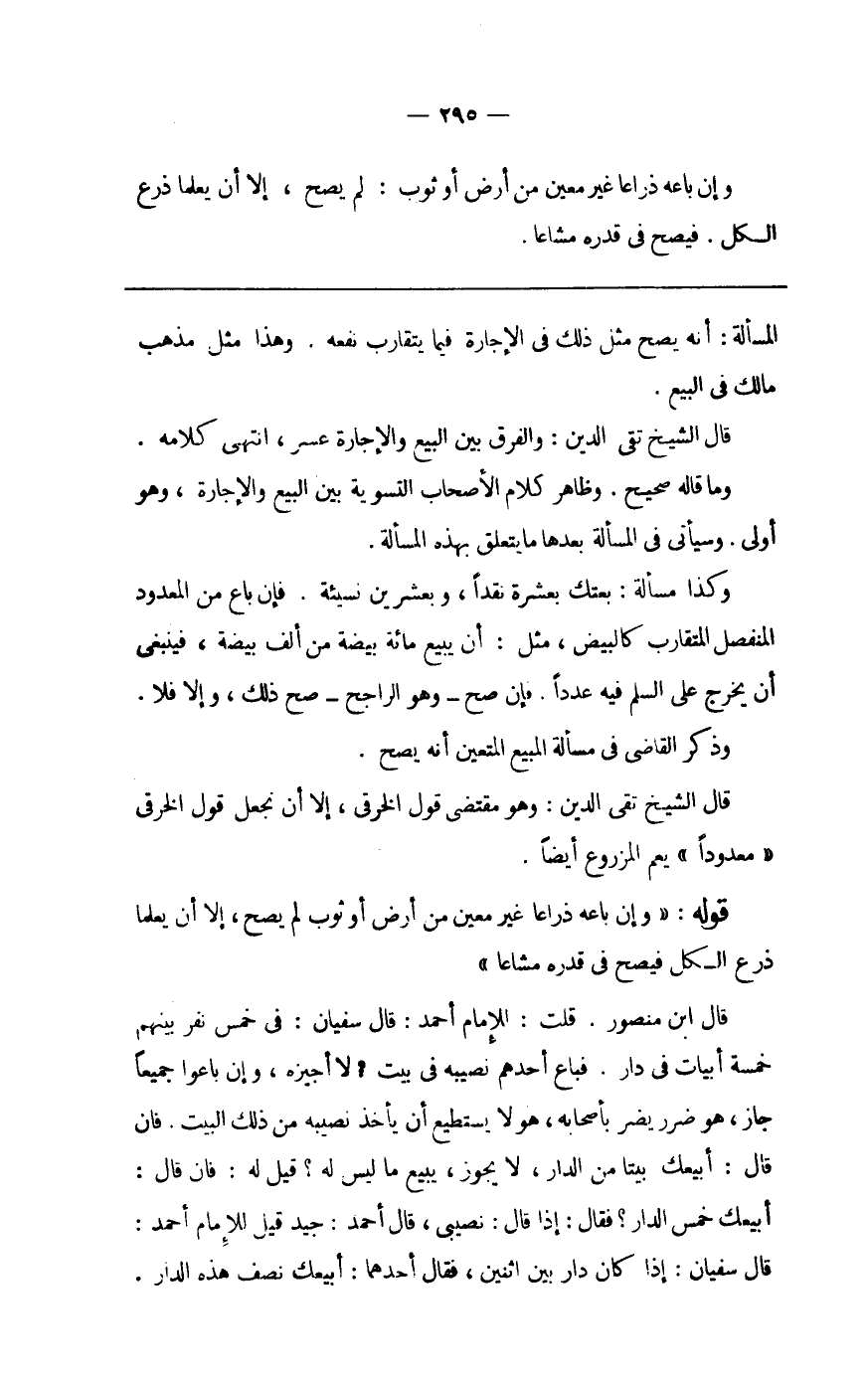قَالَ ابْن مَنْصُور قلت للْإِمَام أَحْمد قَالَ سُفْيَان فِي خمس نفر بَينهم خَمْسَة أَبْيَات فِي دَار فَبَاعَ أحدهم نصِيبه فِي بَيت لَا أجيزه وَإِن باعوا جَمِيعًا جَازَ هُوَ ضَرَر يضر بِأَصْحَابِهِ هُوَ لَا يَسْتَطِيع أَن يَأْخُذ نصِيبه من ذَلِك الْبَيْت فَإِن قَالَ أبيعك بَيْتا من الدَّار لَا يجوز بيع مَا لَيْسَ لَهُ قيل لَهُ فان قَالَ أبيعك خمس الدَّار فَقَالَ إِذا قَالَ نَصِيبي قَالَ أَحْمد جيد قيل للْإِمَام أَحْمد قَالَ سُفْيَان إِذا كَانَ دَار بَين اثْنَيْنِ فَقَالَ أَحدهمَا أبيعك نصف هَذِه الدَّار