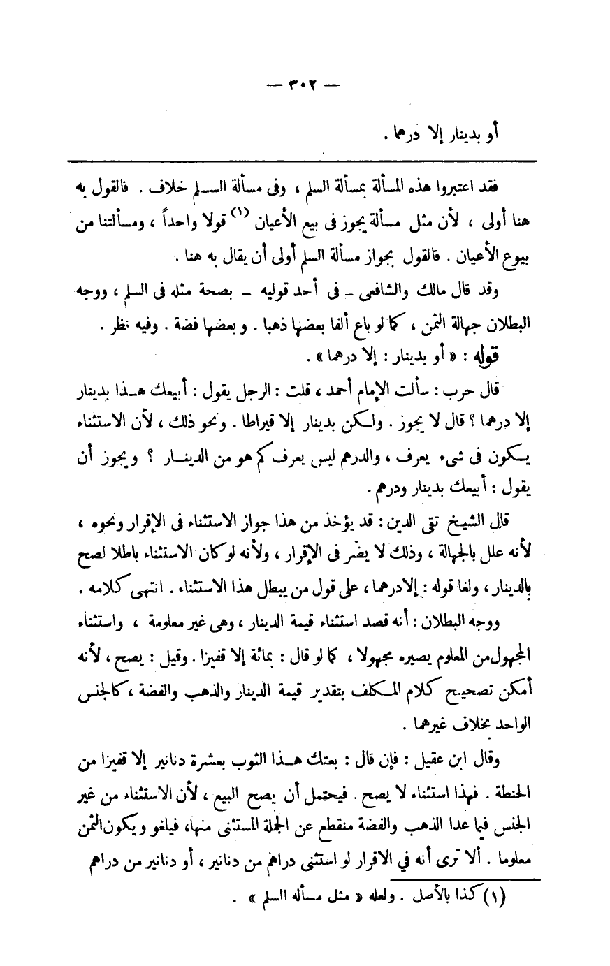قَالَ حَرْب سَأَلت الإِمَام أَحْمد قلت الرجل يَقُول أبيعك هَذَا بِدِينَار إِلَّا درهما قَالَ لَا يجوز وَلَكِن بِدِينَار إِلَّا قيراطا وَنَحْو ذَلِك لِأَن الِاسْتِثْنَاء يكون فِي شَيْء يعرف وَالدِّرْهَم لَيْسَ يعرف كم هُوَ من الدِّينَار وَيجوز أَن يَقُول أبيعك بِدِينَار وَدِرْهَم