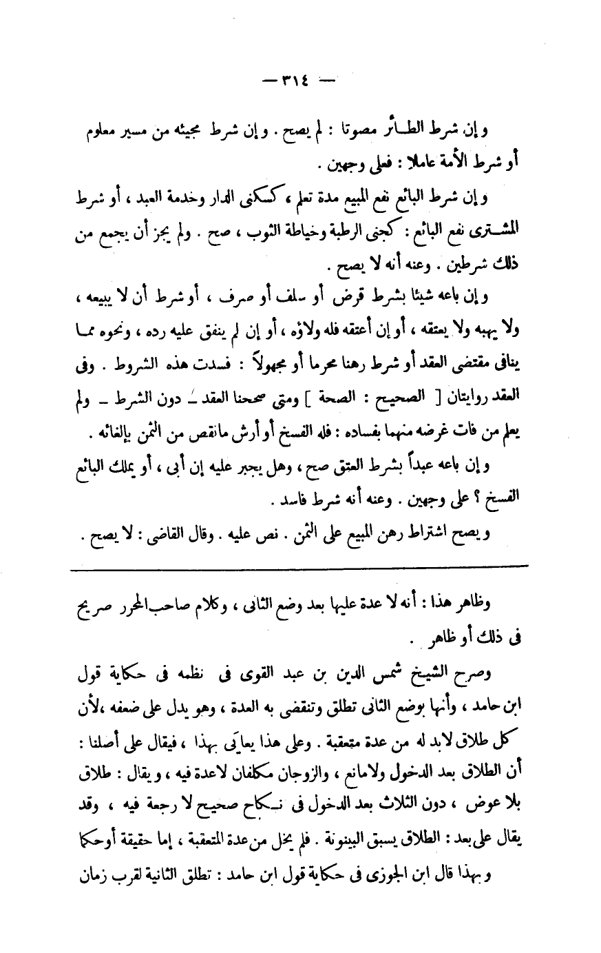 وَصرح الشَّيْخ شمس الدّين بن عبد الْقوي فِي نظمه فِي حِكَايَة قَول ابْن حَامِد وَأَنَّهَا بِوَضْع الثَّانِي تطلق وتنقضي بِهِ الْعدة وَهُوَ يدل على ضعفه لِأَن كل طَلَاق لَا بُد لَهُ من عدَّة متعقبة وعَلى هَذَا يعايى بِهَذَا فَيُقَال على أصلنَا أَن الطَّلَاق بعد الدُّخُول وَلَا مَانع والزوجان مكلفان لَا عدَّة فِيهِ وَيُقَال طَلَاق بِلَا عوض دون الثَّلَاث بعد الدُّخُول فِي نِكَاح صَحِيح لَا رَجْعَة فِيهِ وَقد يُقَال على بعد الطَّلَاق يسْبق الْبَيْنُونَة فَلم يخل من عدَّة المتعقبة إِمَّا حَقِيقَة أَو حكما