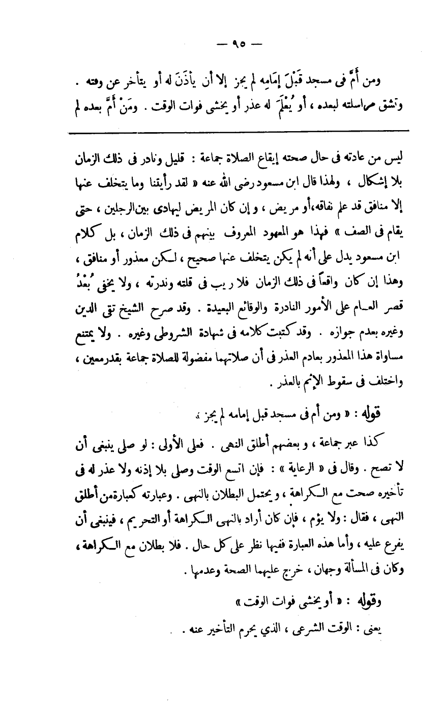 لَيْسَ من عَادَته فِي حَال صِحَّته إِيقَاع الصَّلَاة جمَاعَة قَلِيل ونادر فِي ذَلِك الزَّمَان بِلَا إِشْكَال وَلِهَذَا قَالَ ابْن مَسْعُود رَضِي الله عَنهُ لقد رَأَيْتنَا وَمَا يتَخَلَّف عَنْهَا إِلَّا مُنَافِق قد علم نفَاقه أَو مَرِيض وَإِن كَانَ الْمَرِيض ليهادى بَين الرجلَيْن حَتَّى يُقَام فِي الصَّفّ فَهَذَا هُوَ الْمَعْهُود الْمَعْرُوف بَينهم فِي ذَلِك الزَّمَان بل كَلَام ابْن مَسْعُود يدل على أَنه لم يكن يتَخَلَّف عَنْهَا صَحِيح لَكِن مَعْذُور أَو مُنَافِق وَهَذَا إِن كَانَ وَاقعا فِي ذَلِك الزَّمَان فَلَا ريب فِي قلته وندرته وَلَا يخفى بعد قصر الْعَام على الْأُمُور النادرة والوقائع الْبَعِيدَة وَقد صرح الشَّيْخ تَقِيّ الدّين وَغَيره بِعَدَمِ جَوَازه وَقد كتبت كَلَامه فِي شَهَادَة الشُّرُوطِي وَغَيره وَلَا يمْتَنع مُسَاوَاة هَذَا الْمَعْذُور بعادم الْعذر فِي أَن صلاتهما مفضولة للصَّلَاة جمَاعَة بِقدر معِين وَاخْتلف فِي سُقُوط الْإِثْم بالعذر