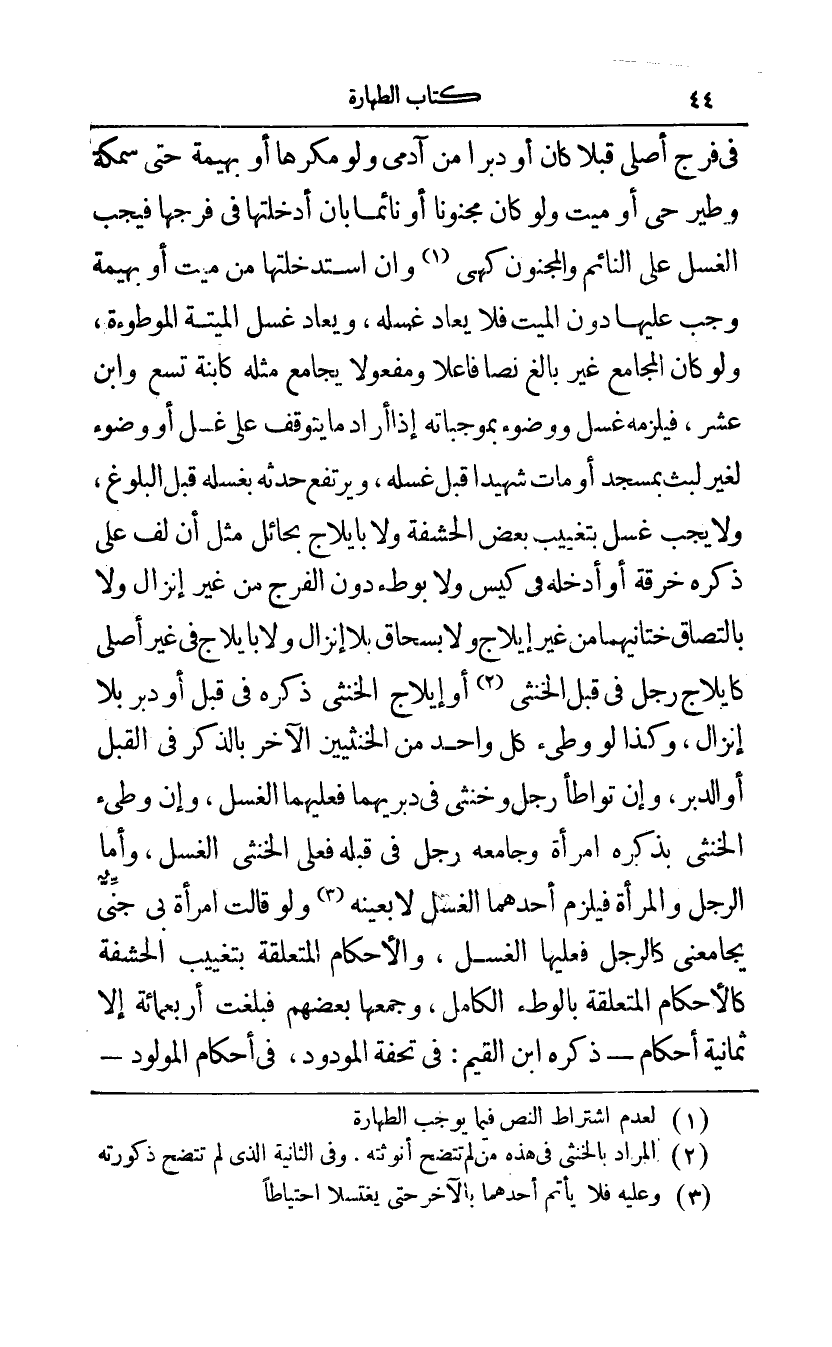 في فرج أصلى قبلا كان أو دبرا من آدمي ولو مكرها أو بهيمة حتى سمكة وطير حي أو ميت ولو كان مجنونا أو نائما بأن أدخلتها في فرجها فيجب الغسل على النائم والمجنون كهي1 وان استدخلتها من ميت أو بهيمة وجب عليها دون الميت فلا يعاد غسله ويعاد غسل الميتة الموطوءة ولو كان المجامع غير بالغ نصا فاعلا ومفعولا يجامع مثله كابنة تسع وابن عشر فيلزمه غسل ووضوء بموجباته إذا أراد ما يتوقف على غسل أو وضوء لغير لبث بمسجد أو مات شهيدا قبل غسله ويرتفع حدثه بغسله قبل البلوغ ولا يجب غسل بتغييب بعض الحشفة ولا بإيلاج بحائل مثل أن لف على ذكره خرقة أو أدخله في كيس ولا بوطء دون الفرج من غير إنزال ولا بالتصاق ختانيهما من غير إيلاج ولا بسحاق بلا إنزال ولا بإيلاج في غير أصلى كإيلاج رجل في قبل الخنثى2 أو إيلاج الخنثى ذكره في قبل أو دبر بلا إنزال وكذا لو وطيء كل واحد الخنثيين الآخر بالذكر في القبل أو الدبر وإن تواطأ رجل وخنثى في دبريهما فعليها الغسل وإن وطئ الخنثى بذكره امرأة وجامعه رجل في قبله فعلى الخنثى الغسل وأما الرجل والمرأة فيلزم أحدهما الغسل لا بعينه3 ولو قالت امرأة بي جني يجامعني كالرجل فعليها الغسل والأحكام المتعلقة بتغييب الحشفة كالأحكام المتعلقة بالوطء الكامل وجمعها بعضهم فبلغت أربعمائة إلا ثمانية أحكام -ذكره ابن القيم: في تحفة المودود في أحكام المولود-