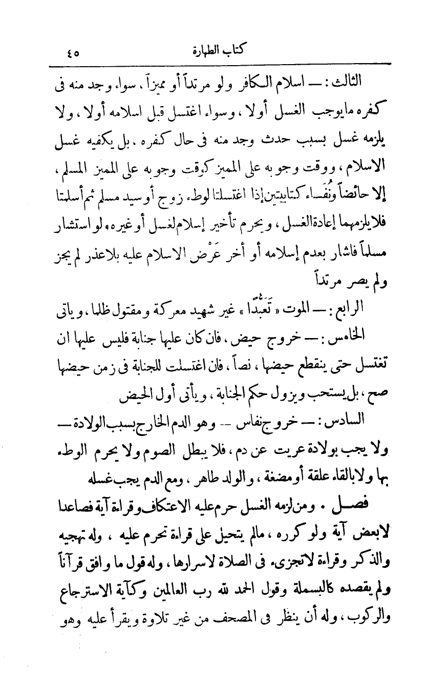 فصل ومن لزمه الغسل حرم عليه الاعتكاف وقراءة آية فصاعدا لا بعض آية ولو كرره