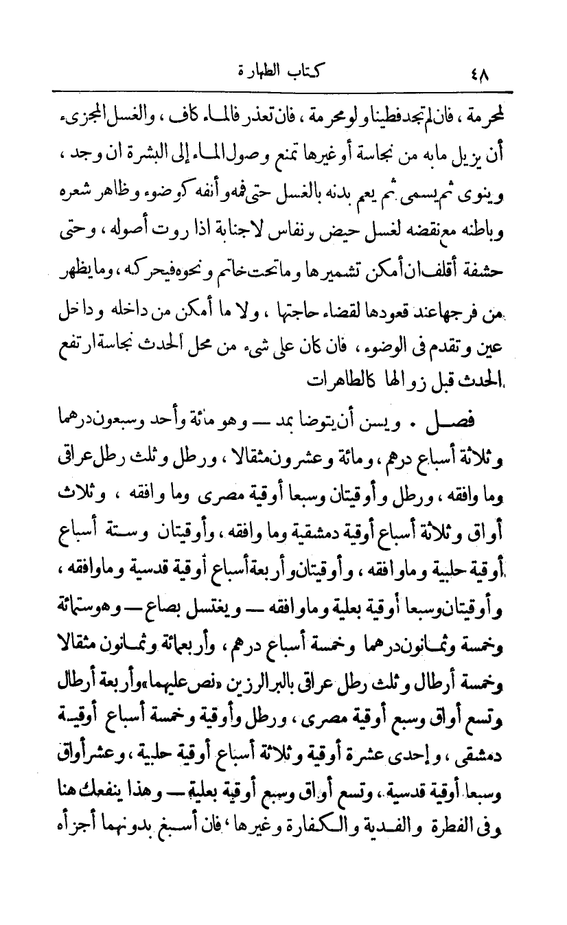 -وهو مائة وأحد وسبعون درهما وثلاثة أسباع درهمهم ومائة وعشرون مثقالا ورطل وثلث رطل عراقي وما وافقه ورطل وأوقيتان وسبعا أوقية مصري وما وافقه وثلاثة أواق وثلاثة أسباع أوقية دمشقية وما وافقه وأوقيتان وستة أسباع أوقية حلبية وما وافقه وأوقيتان وأربعة أسباع أوقية قدسية وما وافقه وأوقيتان وسبعا أوقية بعلية وما وافقه ـ ويغتسل بصاع ـ وهو ستمائة وخمسة وثمانون درهما وخمسة أسباع درهم وأربعمائة وثمانون مثقالا وخمسة أرطال وثلث رطل عراقي بالبر الرزين نص عليهما وأربعة أرطال وتسع أواق وسبع أوقية مصري ورطل وأوقية وخمسة أسباع أوقية دمشقي وإحدى عشرة أوقية وثلاثة أسباع أوقية حلبية وعشر أواق وسبعا أوقية قدسية وتسع أواق وسبع أوقية بعلية ـ وهذا ينفعك هنا وفي الفطرة والفدية والكفارة وغيرها فإن أسبغ بدونهما أجزأه