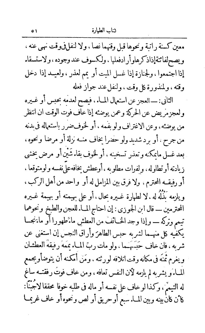 الثاني: العجز عن استعمال الماء فيصح لعدمه بحبس أو غيره ولعجز مريض عن الحركة وعمن يوضئه إذا خاف فوت الوقت إن انتظر من يوضئه وعن الاغتراف ولو بفمه أو لخوف ضرر باستعماله في بدنه جرح أو برد شديد ولو حضرا يخاف منه نزلة أو مرضا ونحوه بعد غسل ما يمكنه وتعذر تسخينه أو لخوف بقاء شين أو مرض يخشى زيادته أو تطاوله ولفوات مطلوبه أو عطش يخافه على نفسه ولو متوقعا أو رفيقه المحترم ولا فرق بين المزامل له أو واحد من أهل الركب ويلزمه بذله له لا لطهارة غيره بحال أو على بهيمته أو بهيمة غيره المحترمين ـ قال ابن الجوزي: ـ إن احتاج الماء للعجن والطبخ ونحوهما تيمم وتركه ـ وإذا وجد الخائف من العطش ماء طهورا أو ماء نجسا يكفيه كل منهما لشربه حبس الطاهر وأراق النجس إن استغنى عن شربه فإن خاف حبسهما ولو مات رب الماء يممه رفيقه العطشان ويغرم ثمنه في مكانه وقت إتلافه لورثته ومن أمكنه أن يتوضأ ويجمع الماء ويشربه لم يلزمه لأن النفس تعافه ومن خاف فوتا رفقته ساغ له التيمم وكذا لو خاف على نفسه أو ماله في طلبه خوفا محققا لا جنبا: كإن كان بينه وبين الماء سبع أو حريق أو لص ونحوه أو خاف غريما