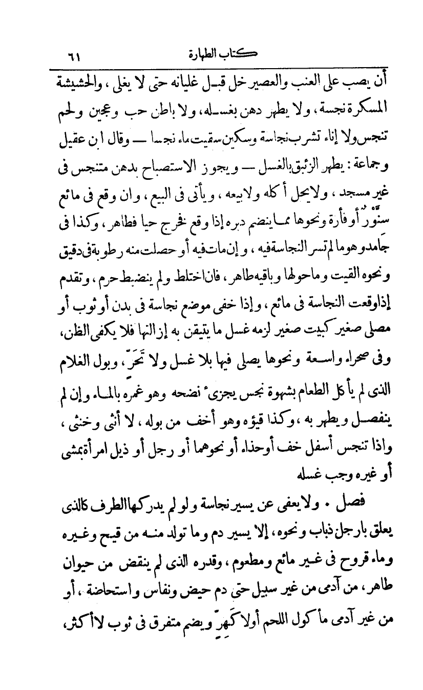 أن يصب على العنب والعصير خلا قبل غليانه حتى لا يغلى والحشيشة المسكرة نجسة ولا يطهر دهن بغسله ولا باطن حب وعجين ولحم تنجس ولا إناء تشرب بنجاسة وسكين سقيت ماء نجسا ـ وقال ابن عقيل وجماعة: يطهر الزئبق بالغسل ـ ويجوز الاستصباح بدهن متنجس في غير مسجد ولا يحل أكله ولا بيعه ويأتي في البيع وإن وقع في مائع سنور أو فأرة ونحوها مما ينضم دبره إذا وقع فخرج حيا فطاهر وكذا في جماد وهو ما لم تسر النجاسة فيه وإن مات فيه أو حصلت منه رطوبة في دقيق ونحوه ألقيت وما وحله وباقيه طاهر فإن اختلط ولم ينضبط حرم وتقدم إذا وقعت النجاسة في مائع وإذا خفي موضع نجاسة في بدن أو ثوب أو مصلى صغير كبيت صغير لزمه غسل ما يتيقن به إزالتها فلا يكفى الظن وفي صحراء واسعة ونحوها يصلى فيها بلا غسل ولا تحر وبول الغلام الذي لم يأكل الطعام بشهوة نجس يجزى نضحه وهو غمره بالماء وإن لم ينفصل ويطهر به وكذا قيؤه وهو أخف من بوله لا أنثى وخنثى وإذا تنجس أسفل خف أو حذاء أو نحوهما أو رجل أو ذيل امرأة بمشي أو غيره وجب غسله.