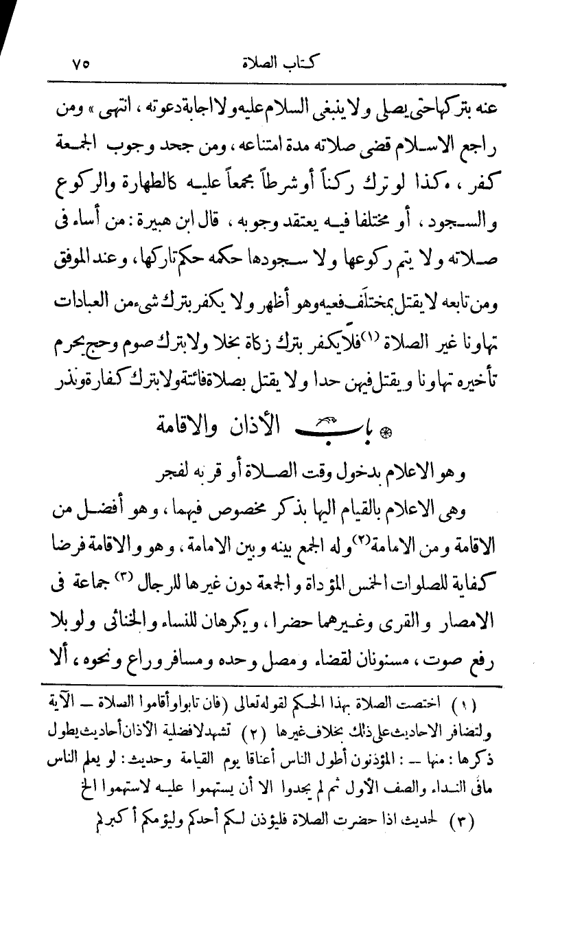 عنه بتركها حتى يصلى ولا ينبغي السلام عيه ولا إجابة دعوته انتهى ومن راجع الإسلام قضى صلاته مدة امتناعه ومن جحد وجوب الجمعة كفر كذا لو ترك ركنا أو شرطا مجمعا عليه كالطهارة والركوع والسجود أو مختلفا فيه يعتقد وجوبه قال ابن هبيرة: من أساء في صلاته ولا يتم ركوعها ولا سجودها حكمه حكم تاركها وعند الموفق ومن تابعه لا يقتل بمختلف فعيه وهو أظهر ولا يكفر بترك شيء من العبادات تهاونا غير الصلاة1 فلا يكفر بترك زكاة ولا بترك صوم وحج ويحرم تأخيره تهاونا ويقتل فيهم حدا ولا يقتل بصلاة فائتة ولا بترك كفارة ونذر.