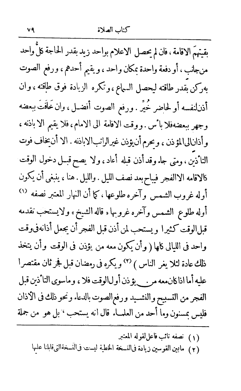 بقيتهم الإقامة فإن لم يحصل الإعلام بواحد زيد بقدر الحاجة كل واحد من جانب أو دفعة واحدة بمكان واحد ويقيم أحدهم ورفع الصوت به ركن بقدر طاقته ليحص السماع وتكره الزيادة فوق طاقته وإن أذن لنفسه أو لحاضر خير ورفع الصوت أفضل وإن خافت ببعضه وجهر ببعضه فلا بأس ووقت الإقامة إلى الإمام فلا يقيم إلا بإذنه وأذان إلى المؤذن ويحرم أن يؤذن غير الراتب إلا بإذنه إلا أن يخاف فوت التأذين ومتى جاء وقد أذن قبله أعاد ولا يصح قبل دخول الوقت كالإقامة إلا الفجر فيباح بعد نصف الليل والليل هنا ينبغي أن يكون أوله غروب الشمس وآخره طلوعها كما أن النهار المعتبر نصفه1 أوله طلوع الشمس وآخره غروبها قاله الشيخ ولا يستحب تقدمه قبل الوقت كثيرا ويستحب لم أذن قبل الفجر أن يجعل آذانه في وقت واحد في الليالي كلها وأن يكون معه من يؤذن في الوقت وأن يتخذ ذلك عادة لئلا يغر الناس2 ويكره في رمضان قبل فجر ثان مقتصرا عليه أما إذا كان معه من يؤذن يؤذن أول الوقت فلا وما سوى التأذين قبل الفجر من التسبيح والنشيد ورفع الصوت بالدعاء ونحو ذلك في الأذان فليس بمسنون وما أحد من العلماء قال أنه يستحب بل هو من جملة